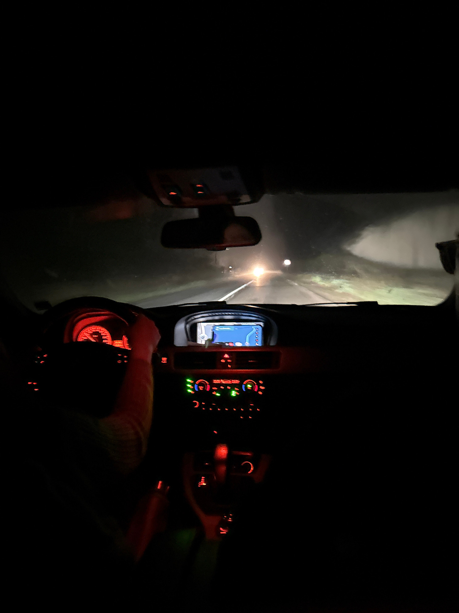 The image shows the interior of a vehicle at night, possibly in Dyuni, Bulgaria. The car is driving on a road. The dashboard is visible, with illuminated gauges and controls. A navigation system displ…read more