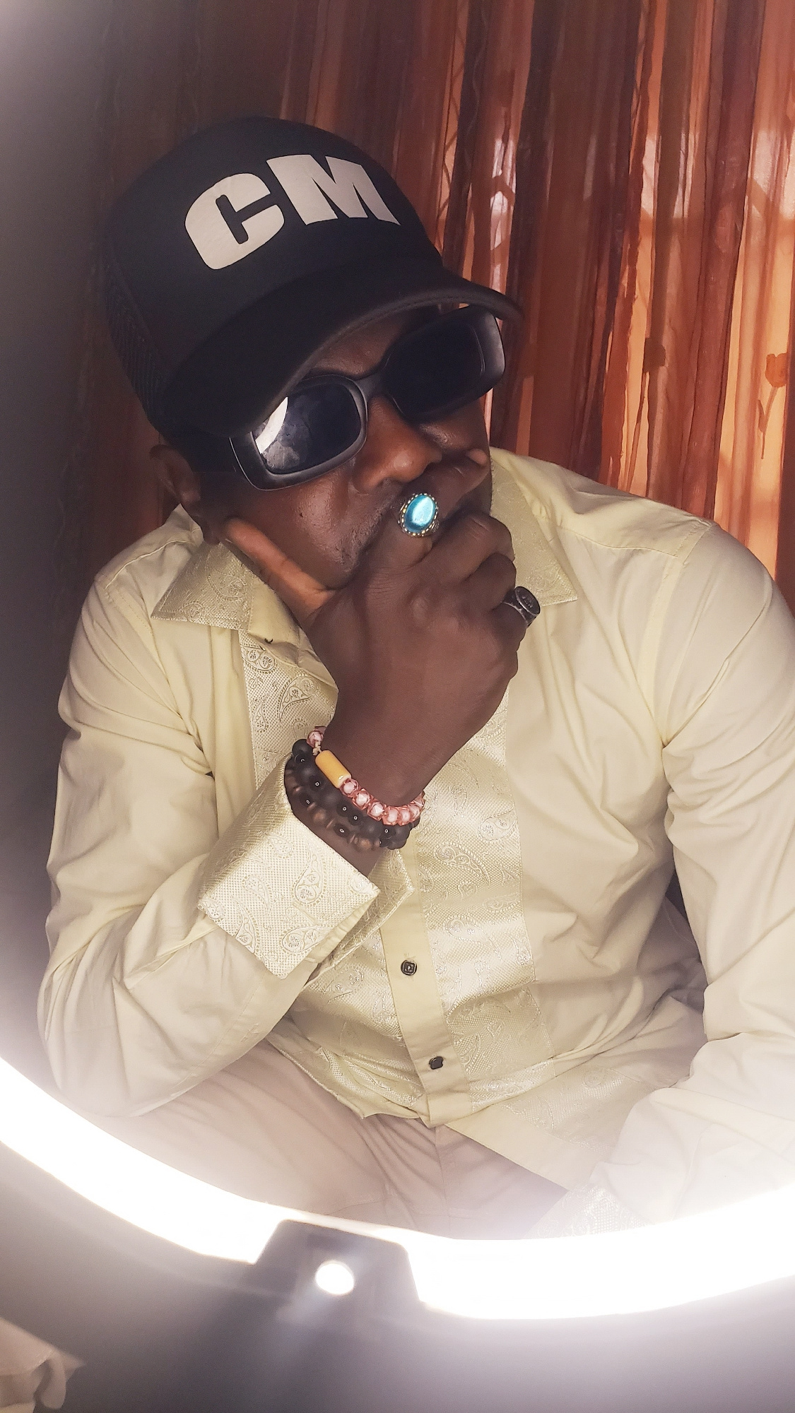 A medium shot of a man in a black baseball cap, sunglasses, and a light yellow button-down shirt. The cap has white lettering visible on the front. He wears two rings and bracelets on his left hand, w…read more