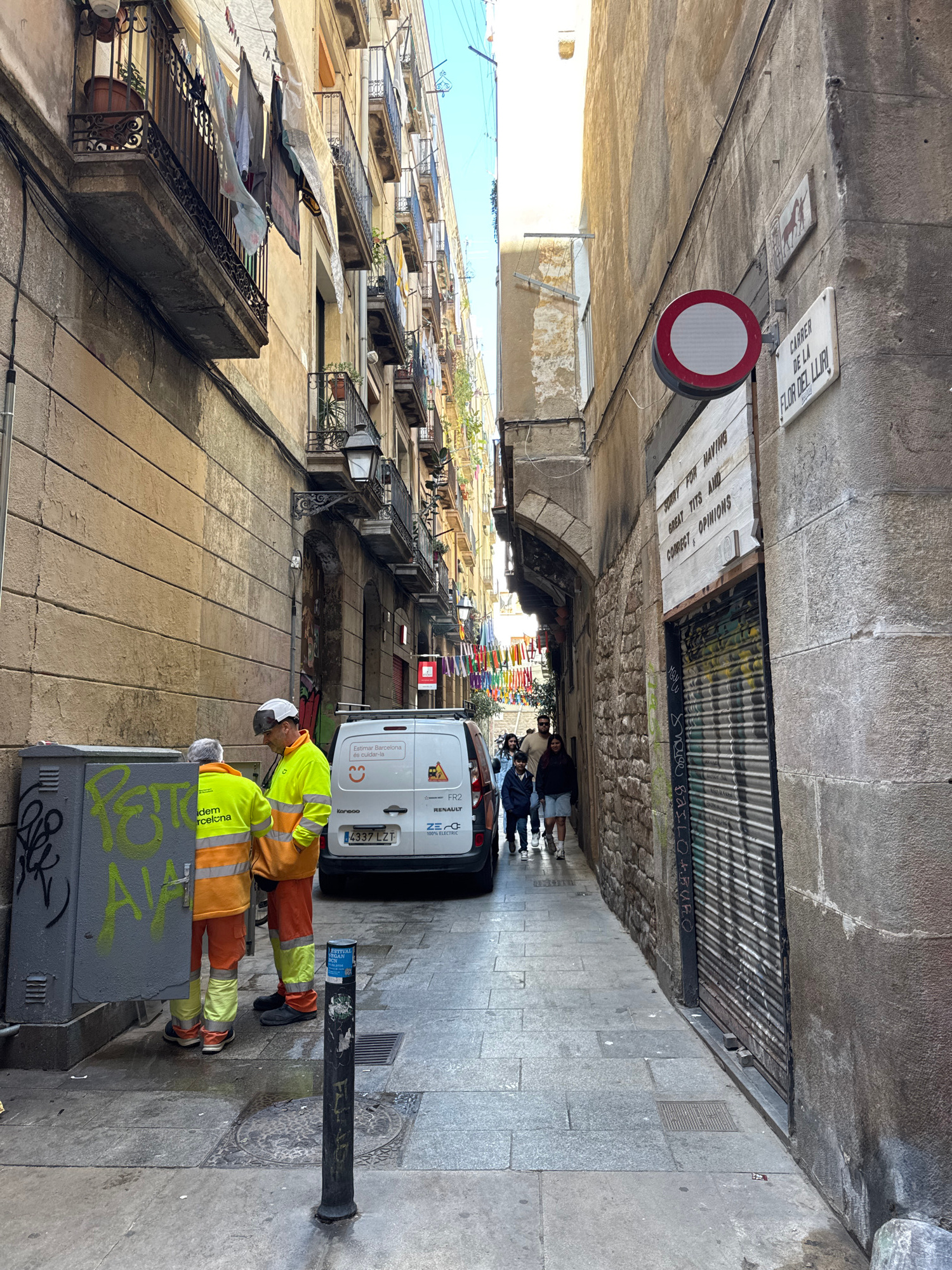 Here is a detailed description of the image: **General Overview:** The image shows a narrow street scene, likely a back alley, in Barcelona, Spain. The street is lined with old buildings on either si…read more