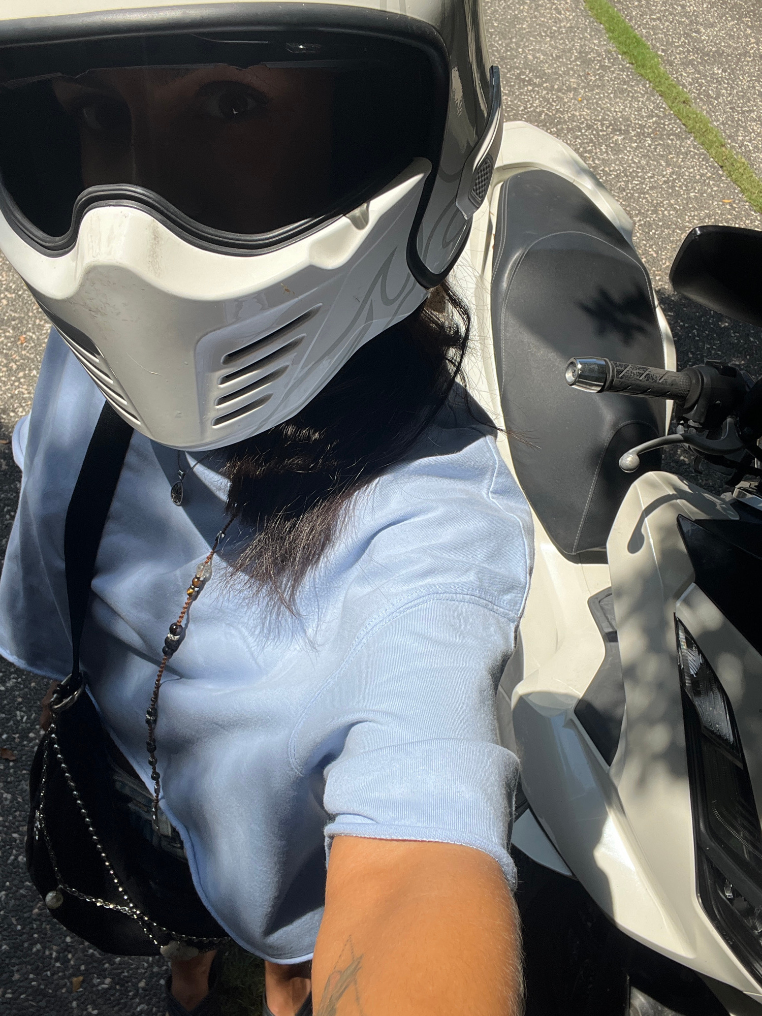 A person wearing a white helmet is sitting on a white scooter on asphalt. The person is wearing a light blue long-sleeved shirt and a black bag. The person has black hair. The location is not discerni…read more