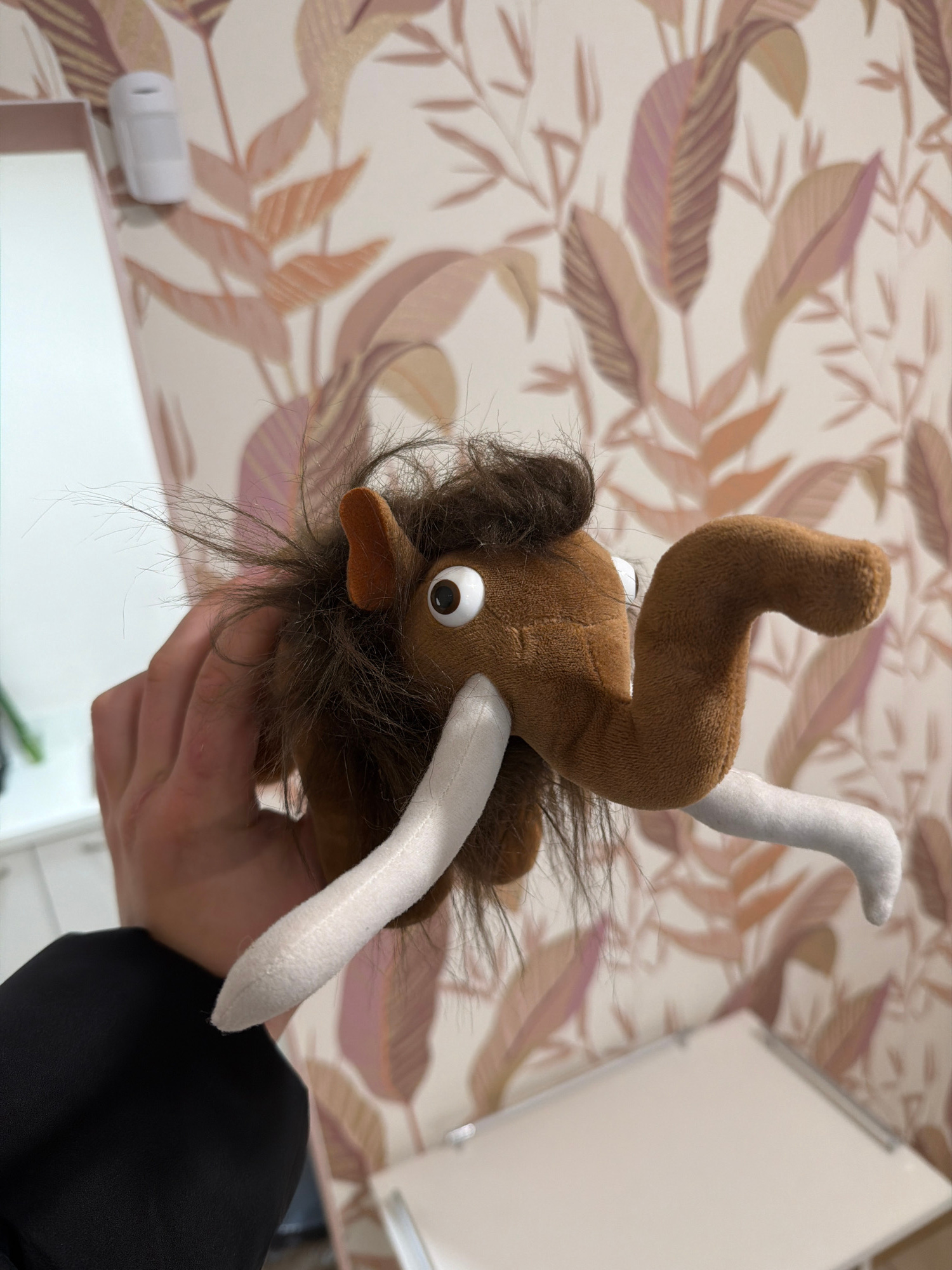 A brown plush mammoth toy is being held up in front of a wall decorated with a leaf pattern. The toy has white tusks and shaggy brown fur around its face. A hand wearing a black sleeve is holding the…read more