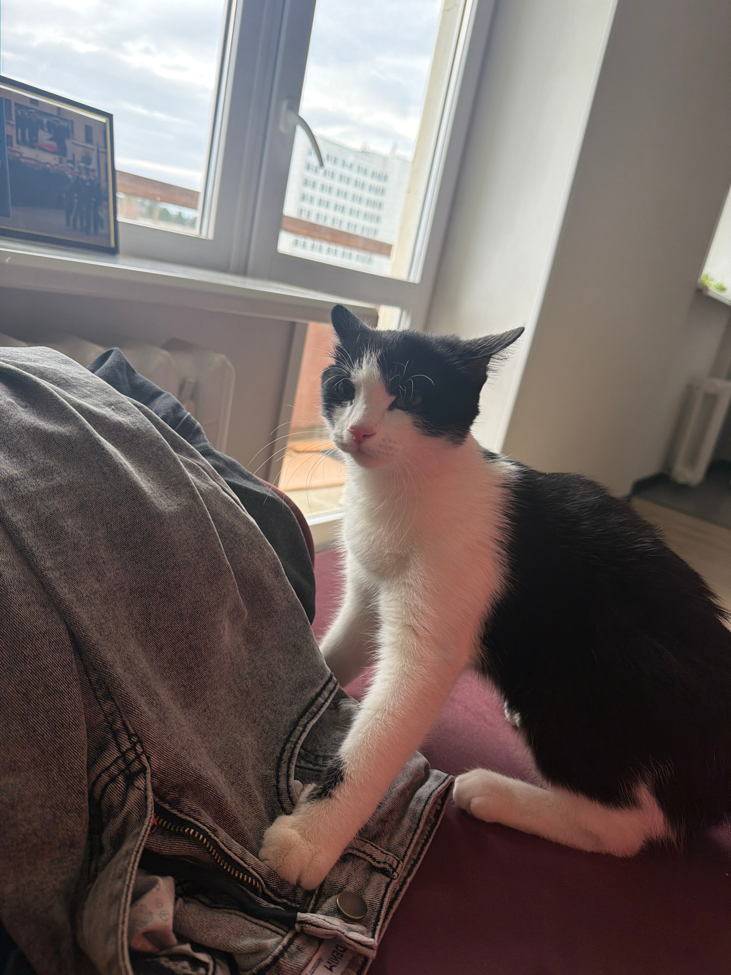 A tuxedo cat is perched on a pile of gray clothing. The cat is predominantly black with white markings on its chest, face, and paws. It extends its right paw onto the zipper of a pair of jeans. Behindβ¦read more