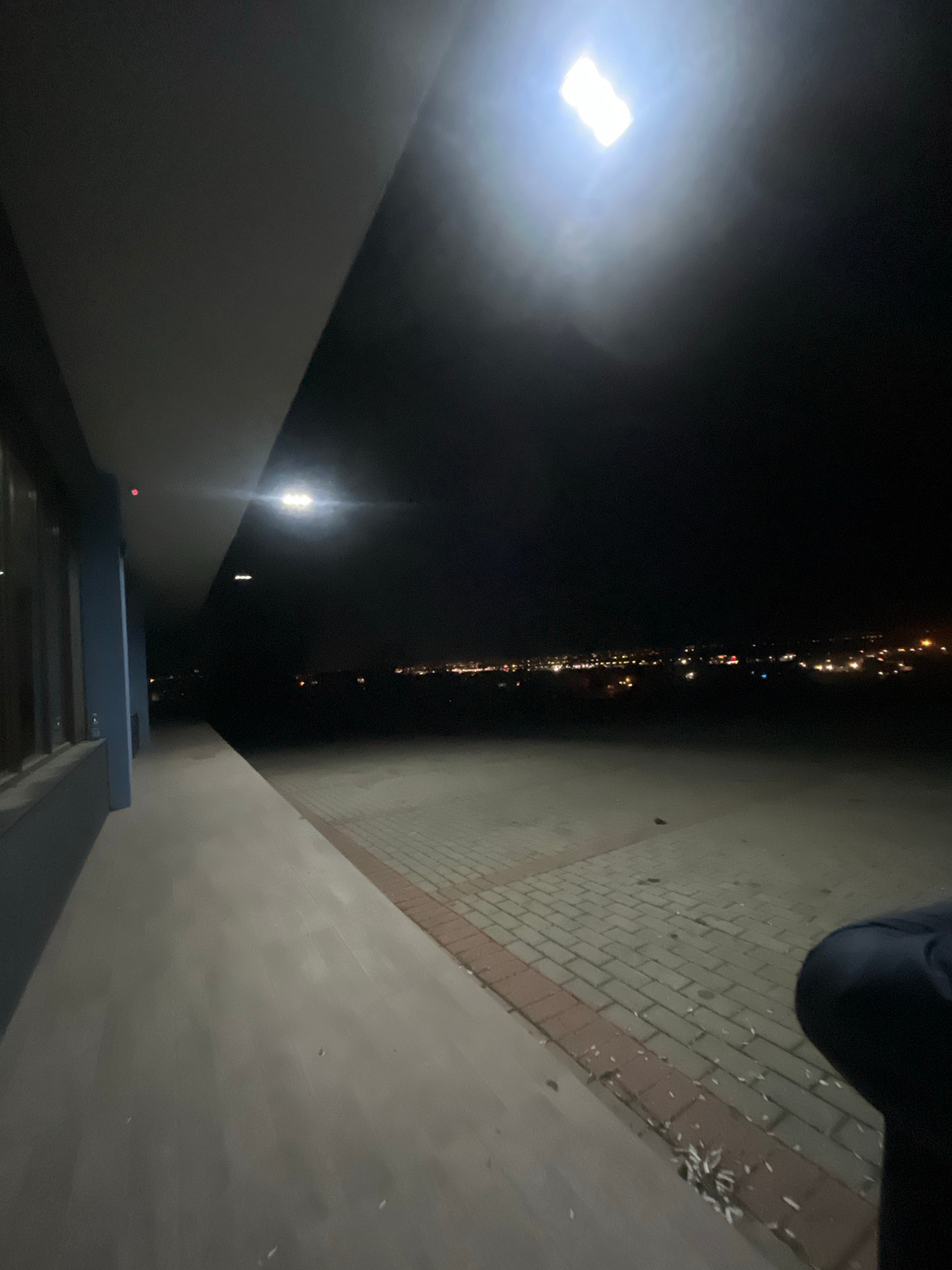 A night shot taken at an angle shows a staircase leading down, flanked by walls on either side. To the left, a bright, square-shaped light source illuminates the wall. In the distance, a line of blurr…read more