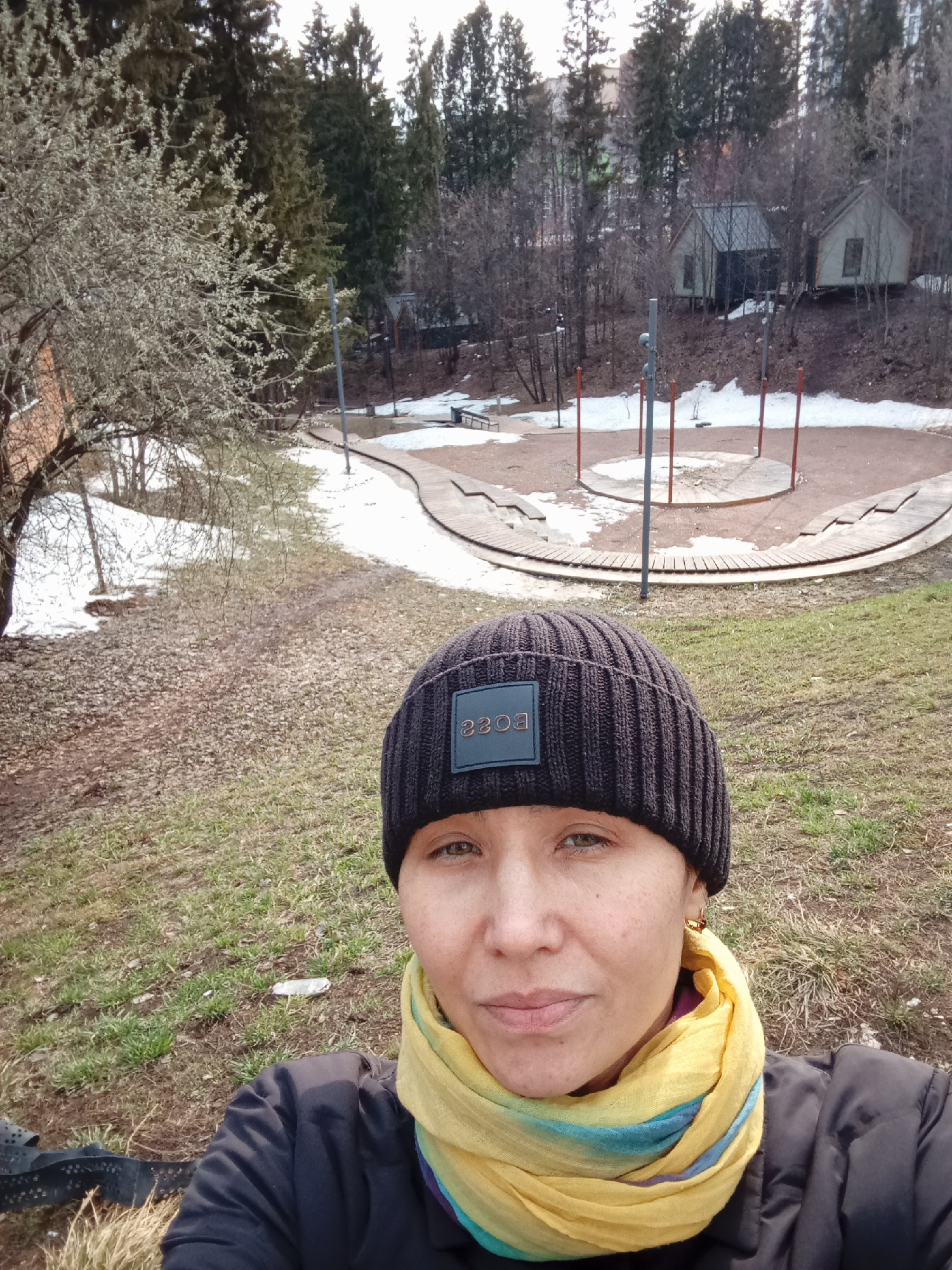 The image is a selfie of a woman wearing a dark-colored beanie with the word "BOSS" on a square patch, a dark jacket, and a yellow scarf with blue accents. She is positioned in the foreground. Behind…read more