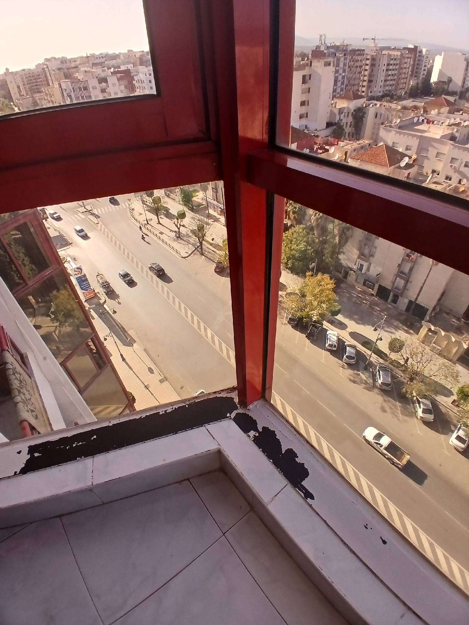 The image shows a view from a high vantage point, possibly a balcony or window of a tall building, in Meknes, Morocco. The perspective is angled downward, revealing a city scene. In the upper portion…read more