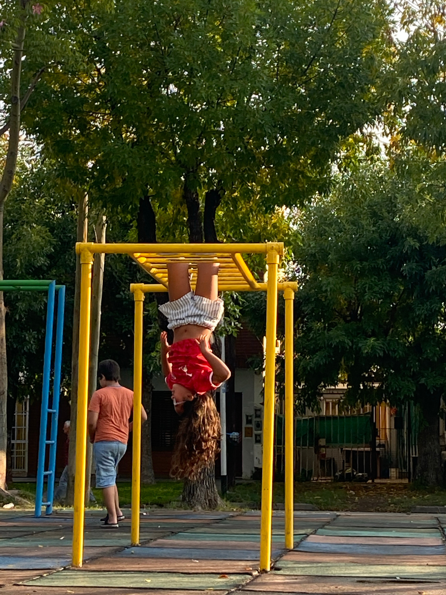A young person in a red shirt and striped shorts hangs upside down on a yellow jungle gym in a playground. Her long, dark hair streams down. Another person in an orange shirt and blue shorts performsβ¦read more
