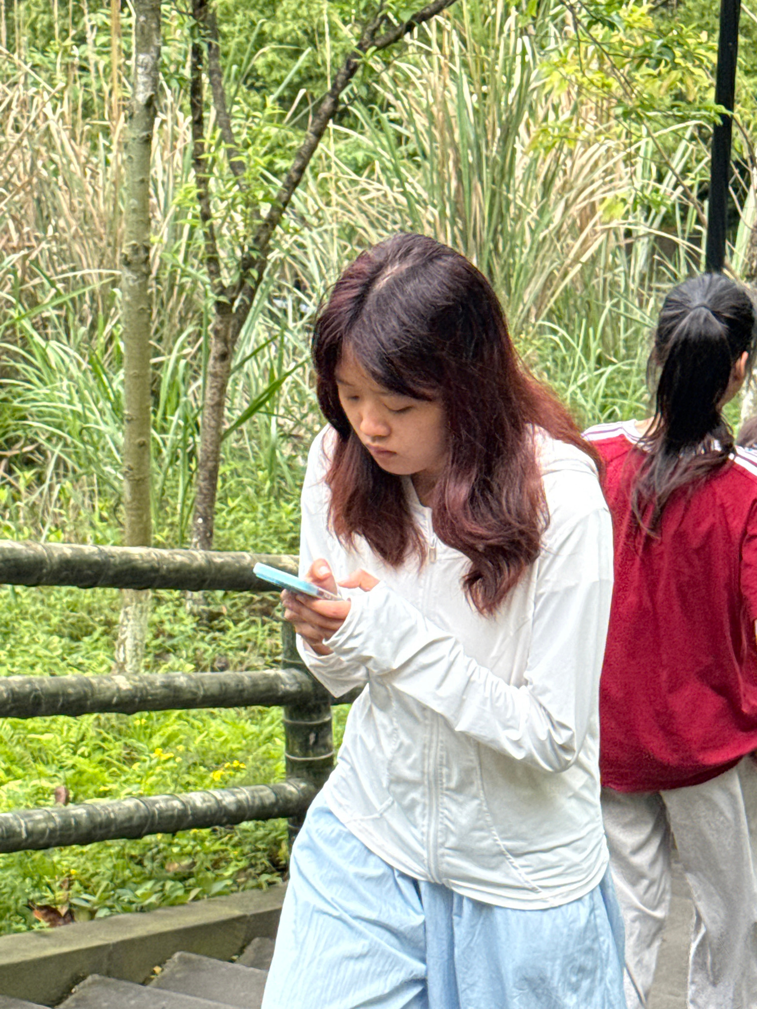 Two people stand outdoors near a wooded area. One individual is wearing a white jacket and a light blue garment, possibly a dress or skirt, and holds a slender blue object in their hand, possibly a ph…read more