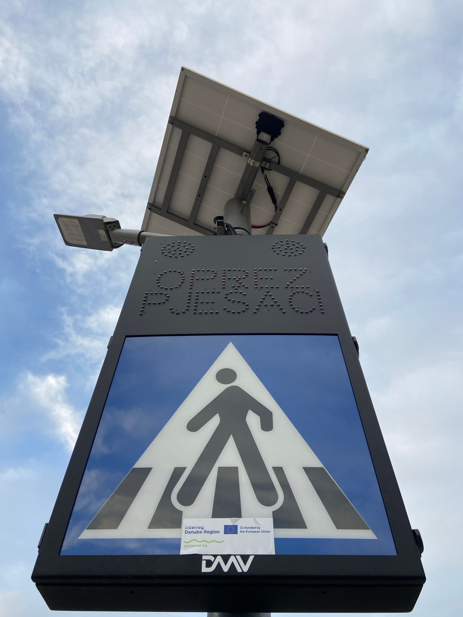 The image depicts a solar-powered pedestrian crossing sign in Budva, Montenegro. The sign is mounted on a gray pole. A solar panel is attached to the top of the pole. The sign itself is rectangular wi…read more
