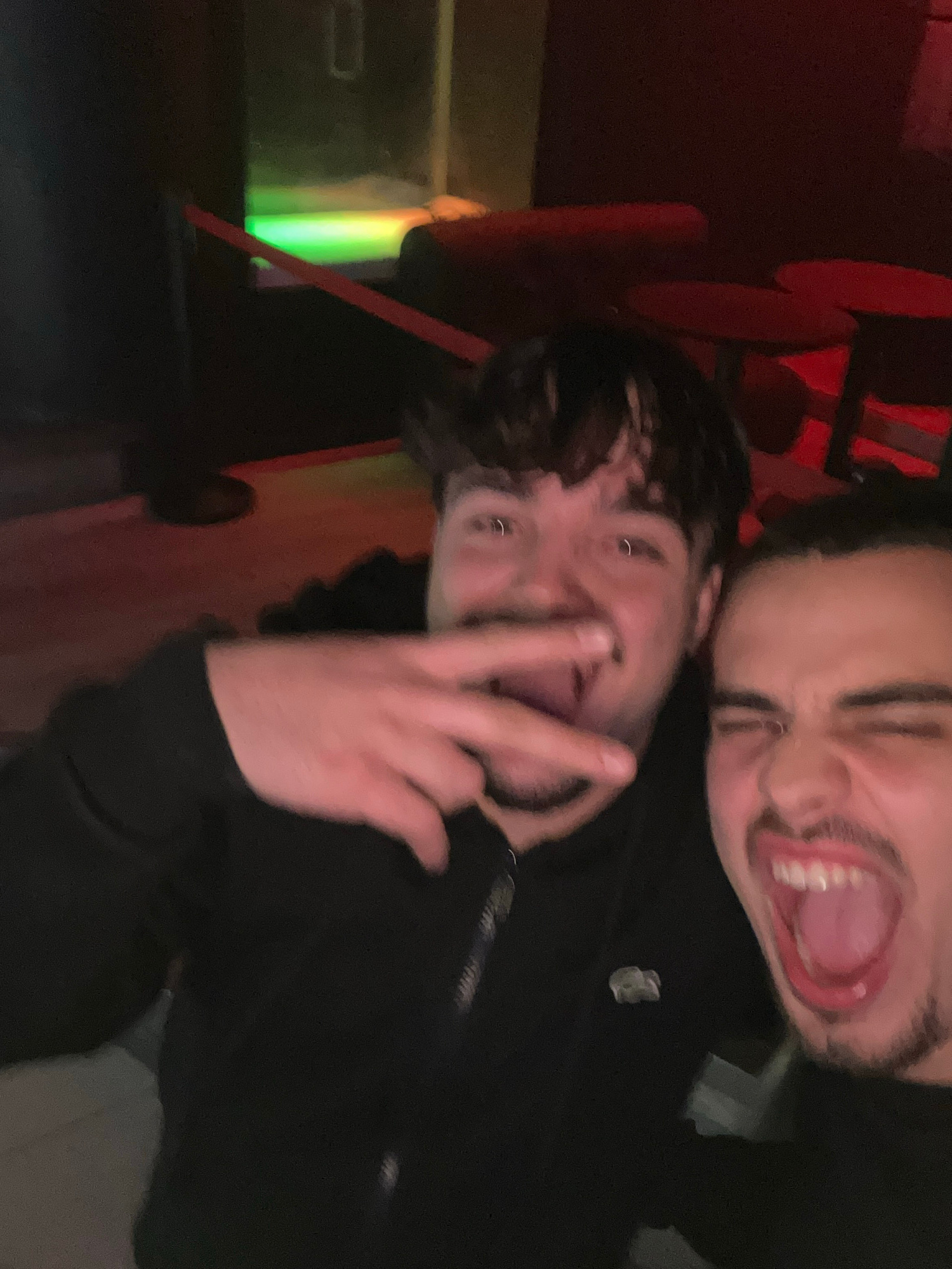 Two young men are close together, posing for a photograph. The man in the foreground has dark hair and is making a peace sign with his left hand. He has multiple piercings on his left ear. The man in…read more