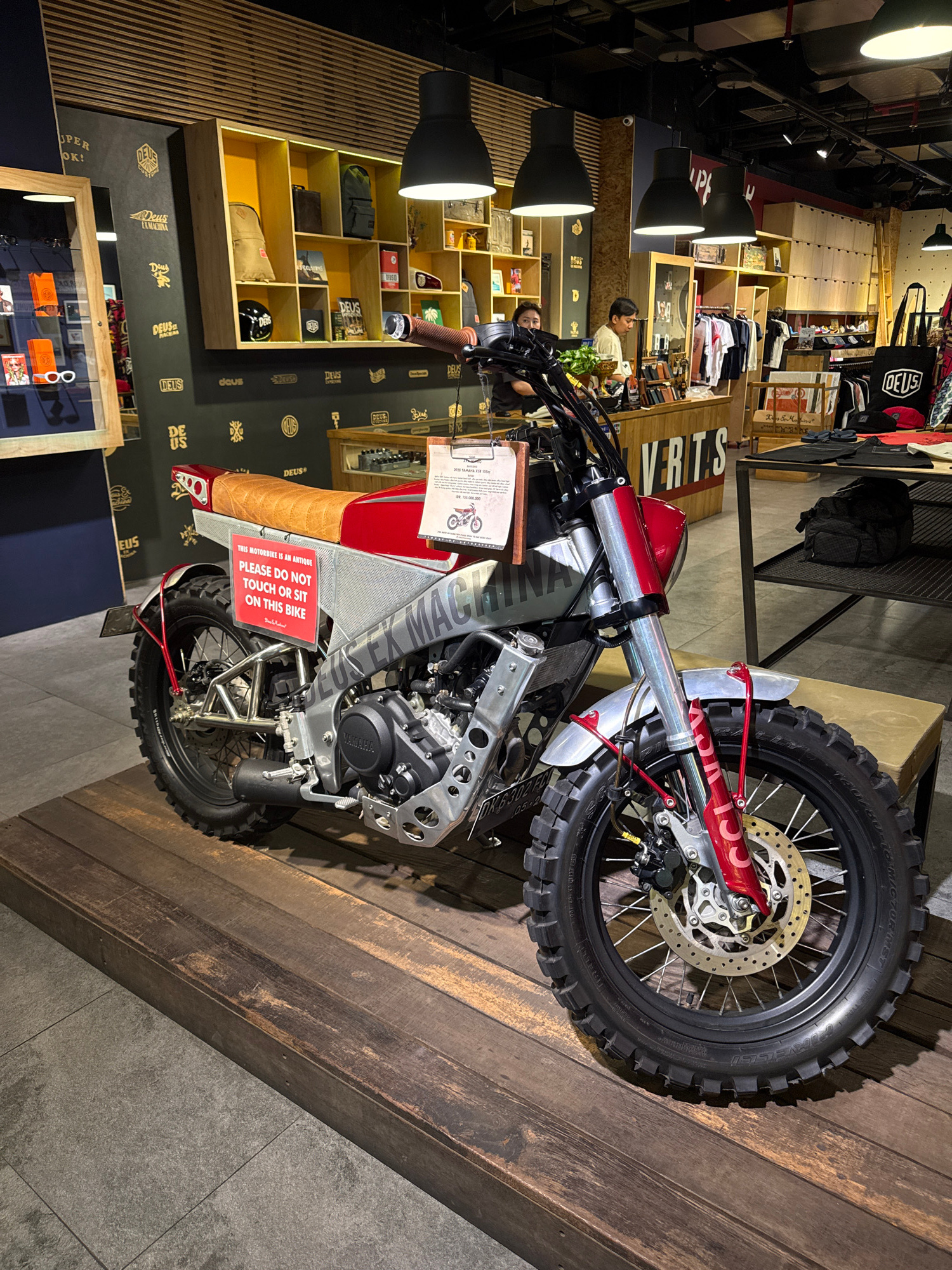 The image shows a custom Yamaha XSR 155 motorcycle displayed at the Deus Ex Machina store, presumably in Kuta, Indonesia. The motorcycle is elevated on a wooden platform within the store. It features…read more