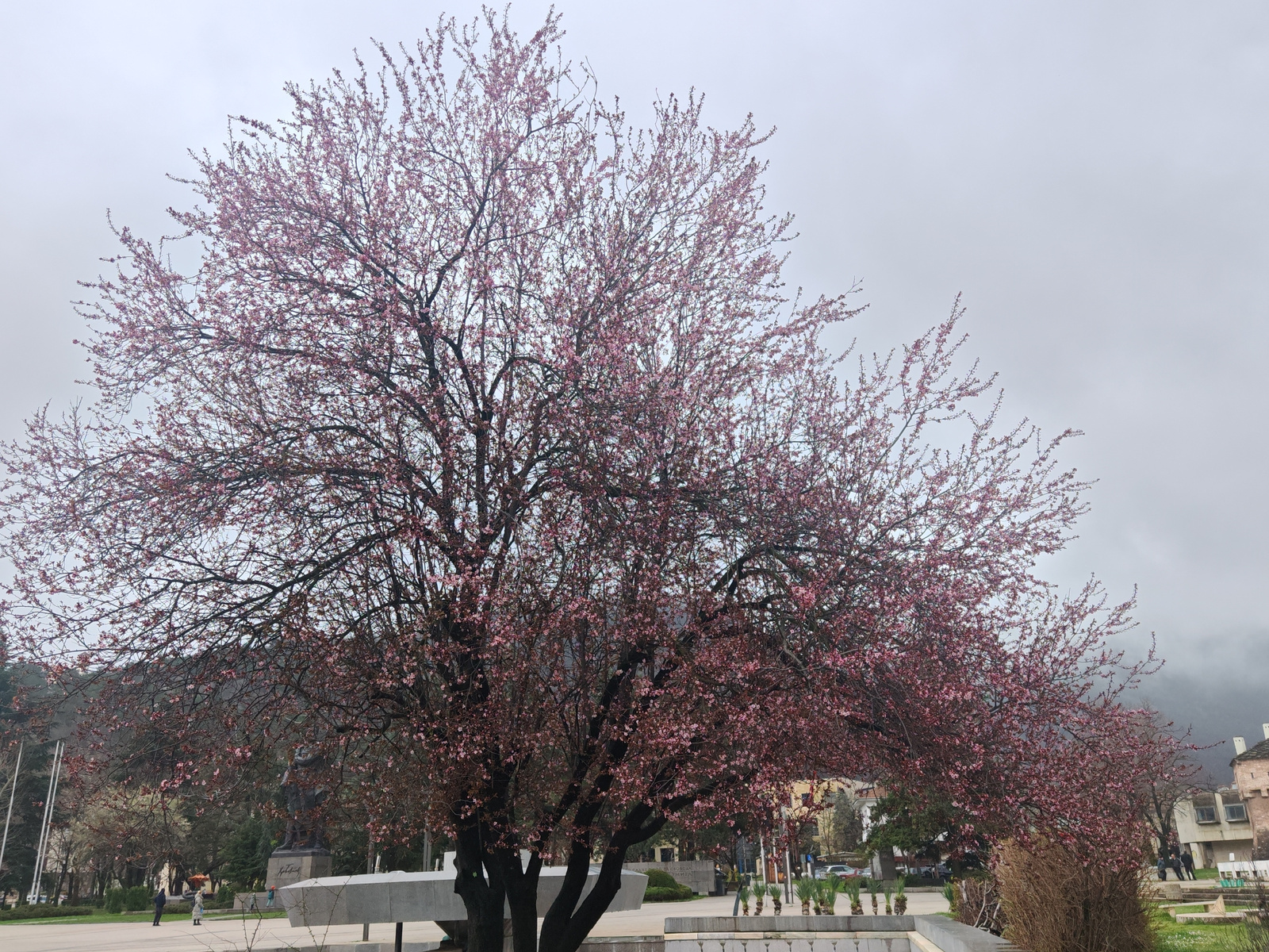The image shows a blossoming tree with pink flowers in the city of Vratsa, Bulgaria. The tree is in a public square with concrete benches and other landscaping elements. In the background, there are b…read more