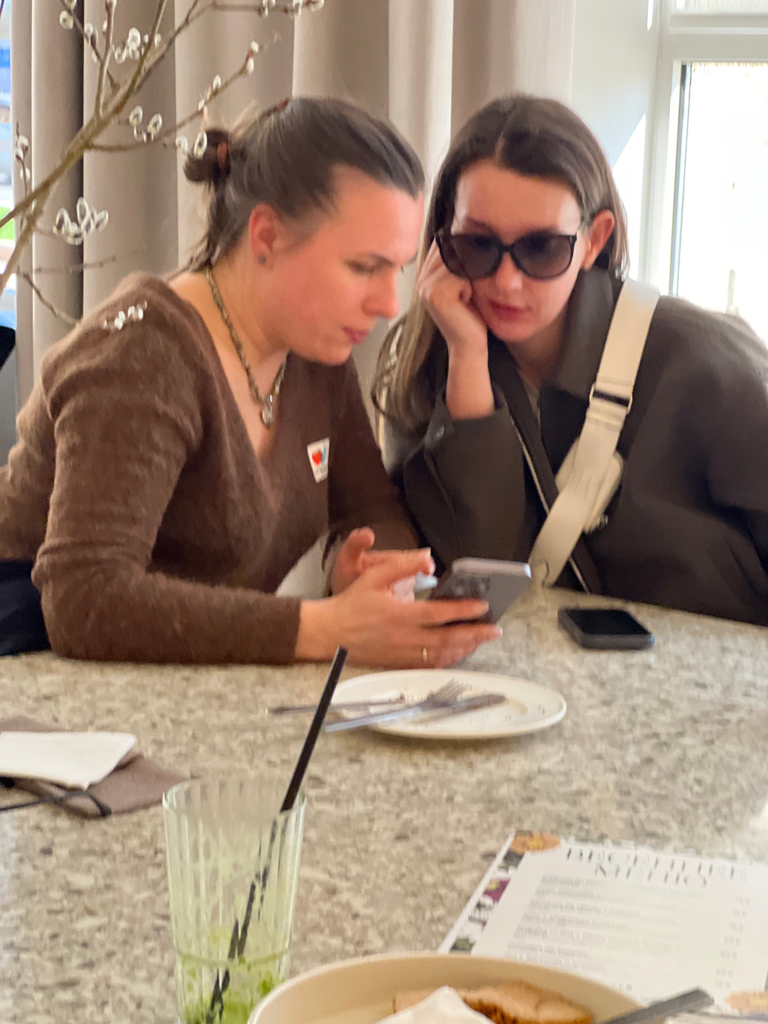 Two women are sitting at a table inside a cafe. One woman is looking at her cell phone while the other woman is resting her face on her hand and wearing sunglasses. There is a plate, silverware, glass…read more