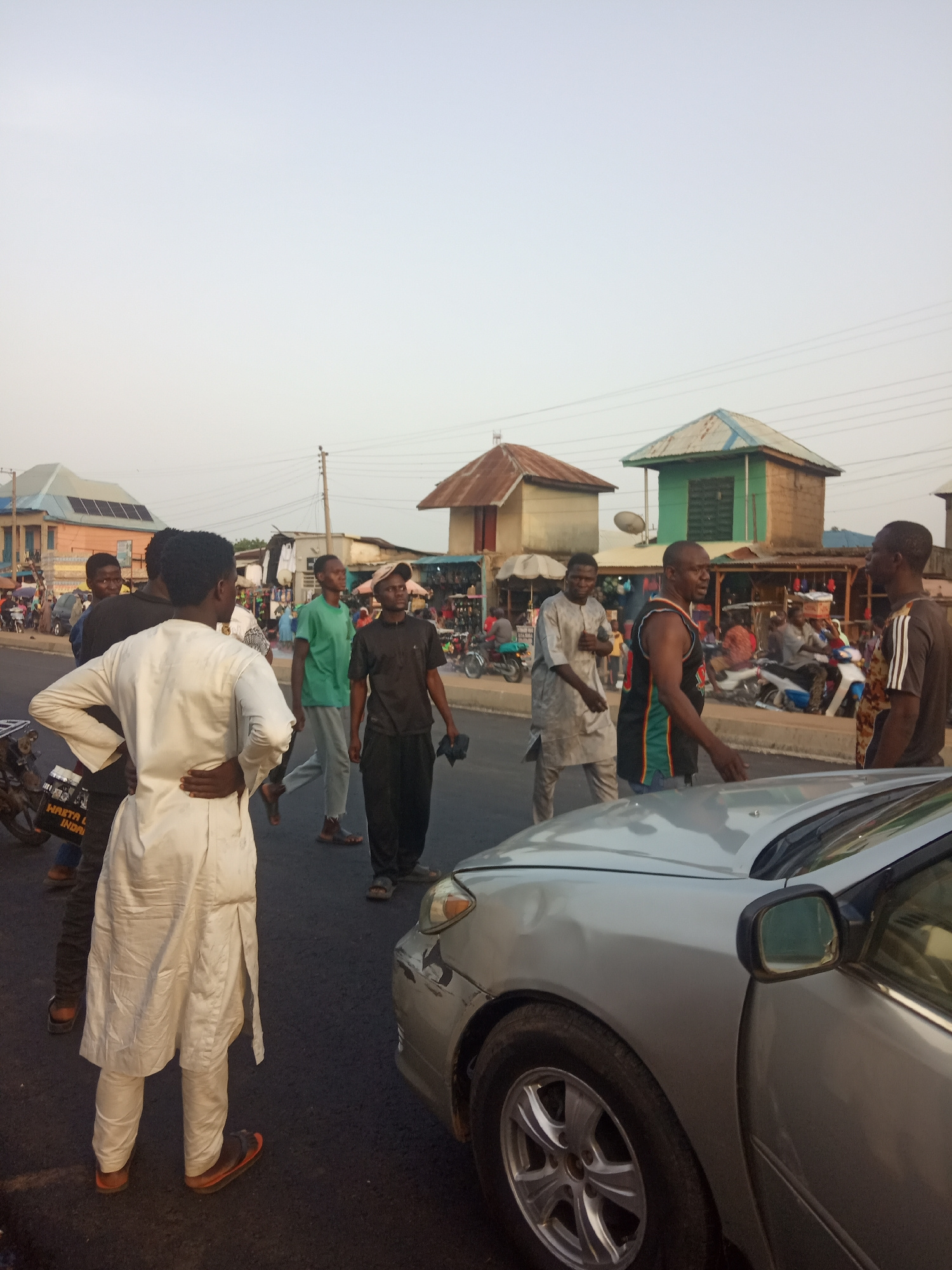 The image shows a street scene in Akwanga, Nigeria. A group of men stands on a paved road around a silver car with damage to the front passenger side. The men are dressed in a variety of casual and tr…read more