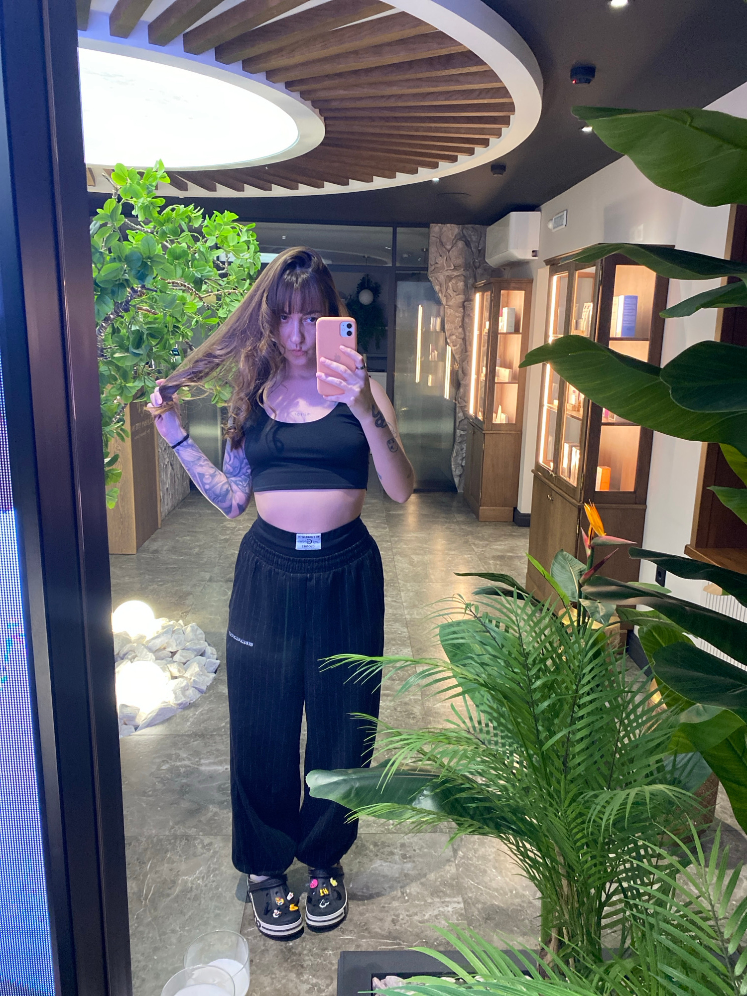 A woman is taking a mirror selfie indoors. She is wearing a black crop top and black pants. She has tattoos on her arm. The background includes plants, a decorative wooden arch, and display cases. The…read more