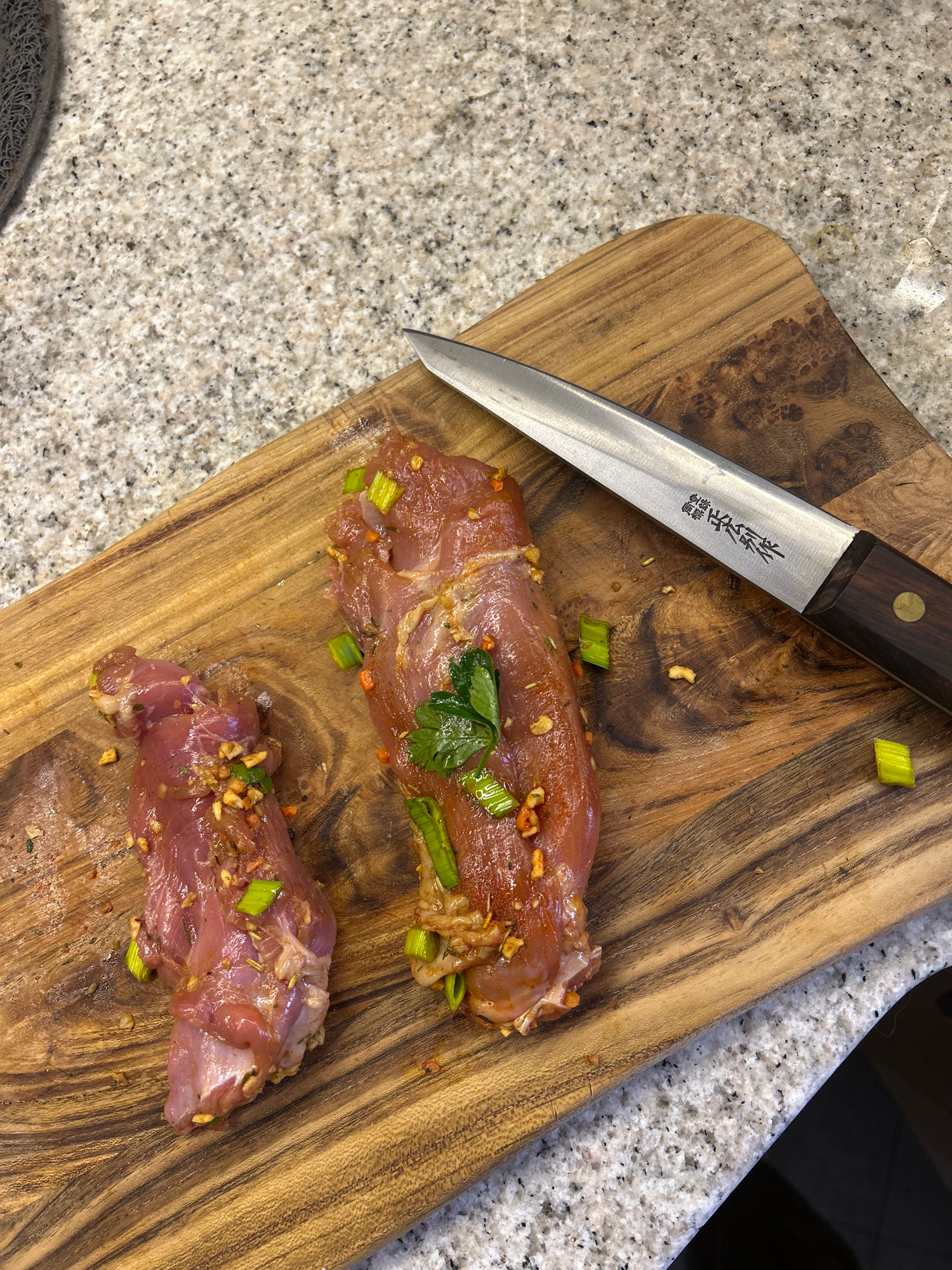 A wooden cutting board rests on a speckled countertop. A sharp knife with a wooden handle lies on the cutting board, next to two pieces of raw meat marinated with herbs and spices. The surrounding env…read more