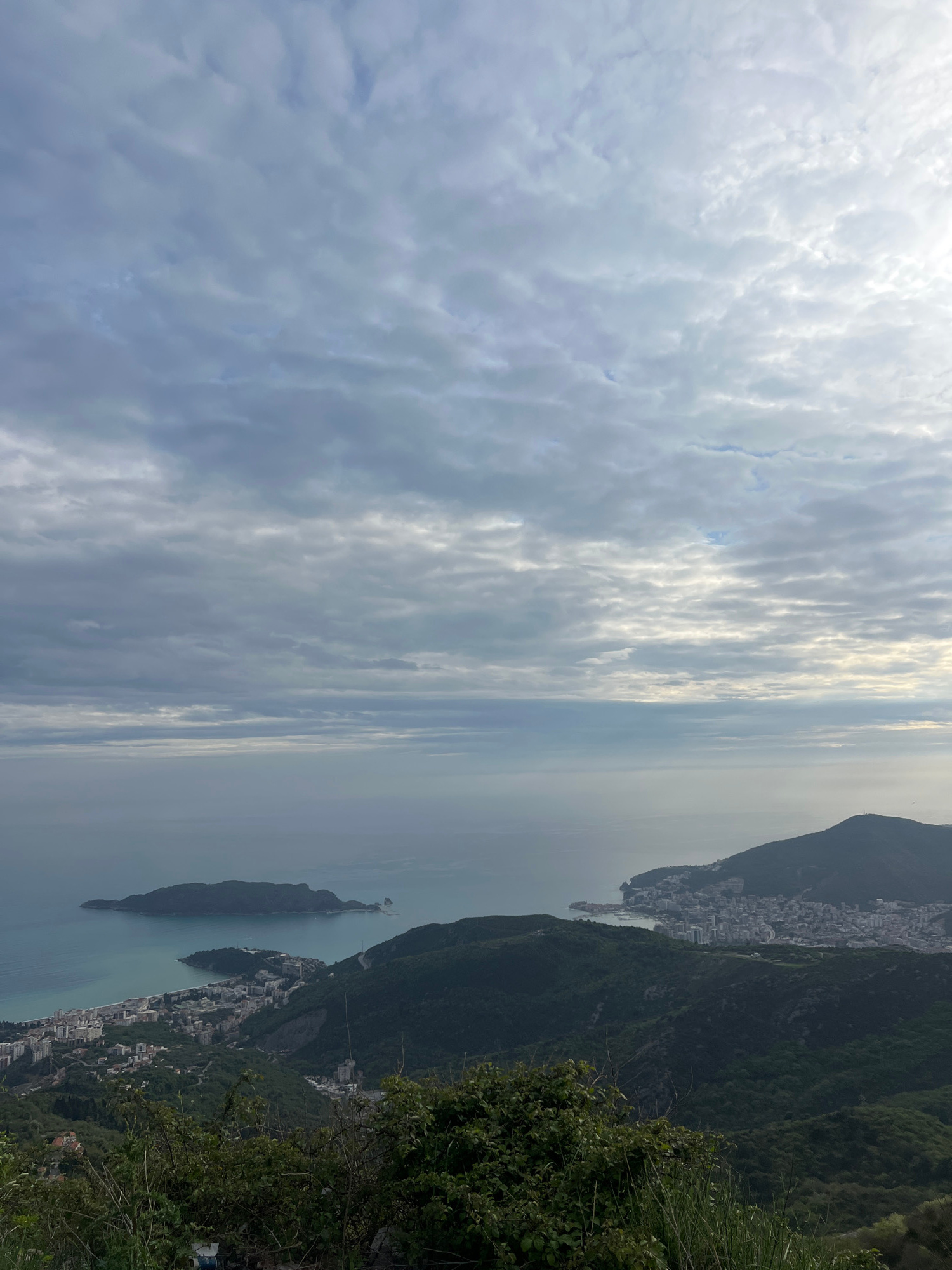 The image presents a high-angle view of the coastline near Brajici, Montenegro. A cloudy sky occupies the left portion of the frame. The Adriatic Sea is visible towards the center, with landmasses and…read more