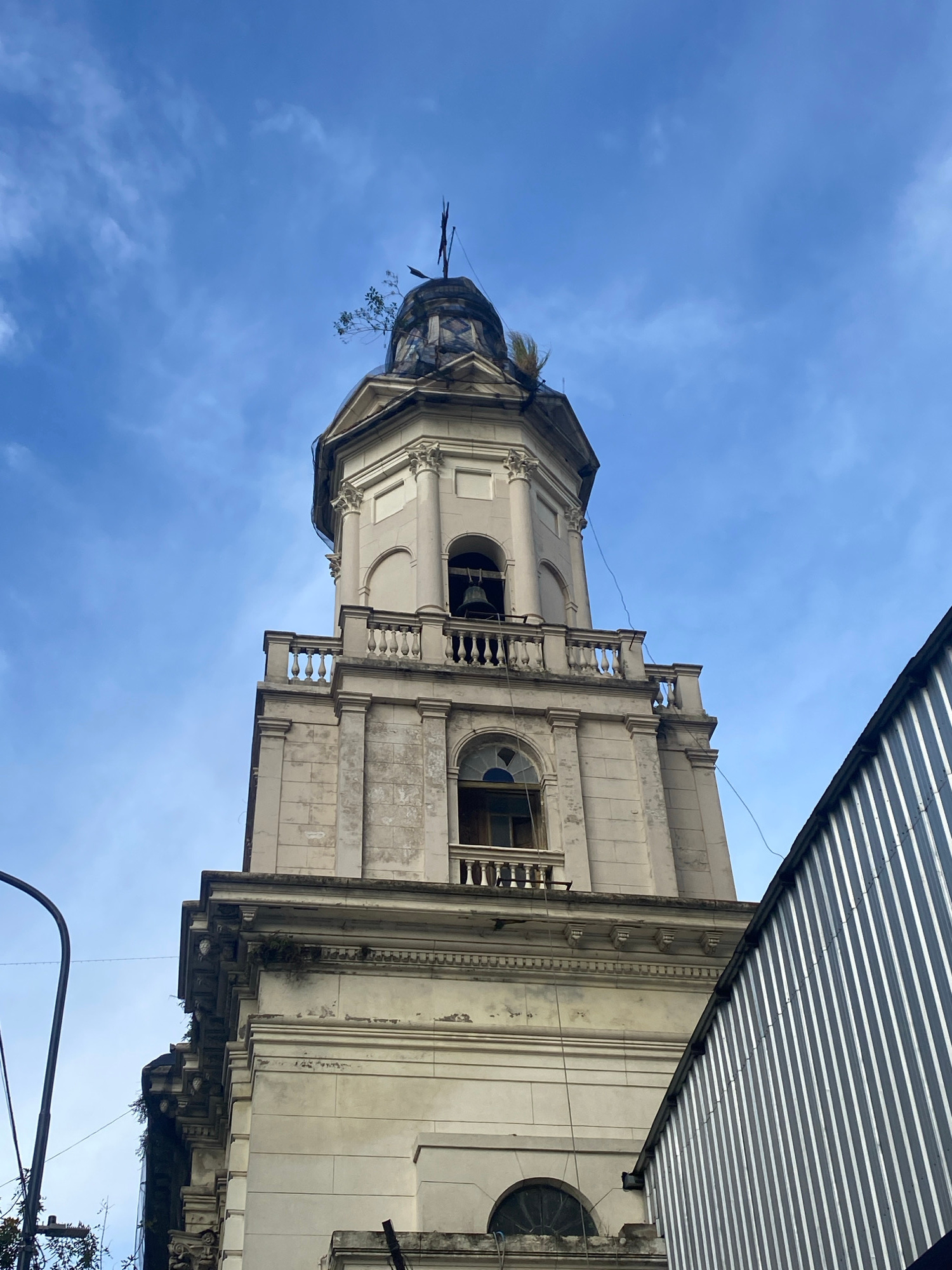 The image depicts the bell tower of the Basílica del Santísimo Sacramento, located in Buenos Aires, Argentina. The tower is captured from a low-angle perspective, showcasing its architectural details…read more