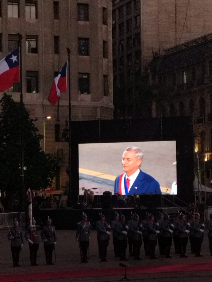 An outdoor, nighttime scene in Santiago, Chile, depicting a public ceremony, likely in the vicinity of the Palacio de La Moneda. A large LED screen occupies the central mid-ground, displaying a medium…read more