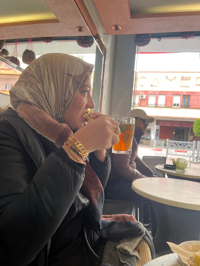 This image depicts an indoor cafe scene, identified as being in Meknes, Morocco, due to the visible "CAMEL" signage on a red building observed through the window, likely referencing Café Camel. In the…read more
