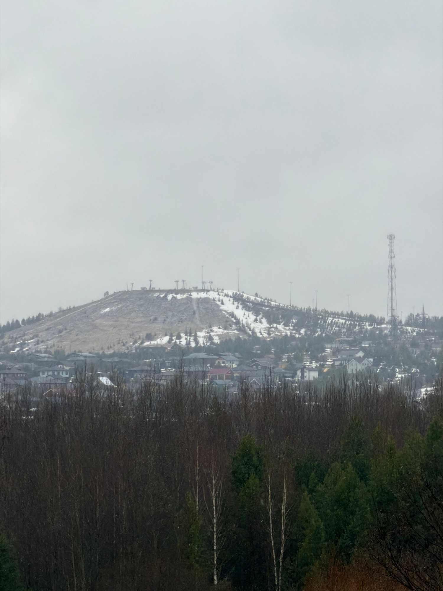 The image shows a view of Izhevsk, Russia, from a high vantage point. The scene is dominated by a snow-covered hill with scattered buildings and trees. A prominent communication tower stands atop the…read more