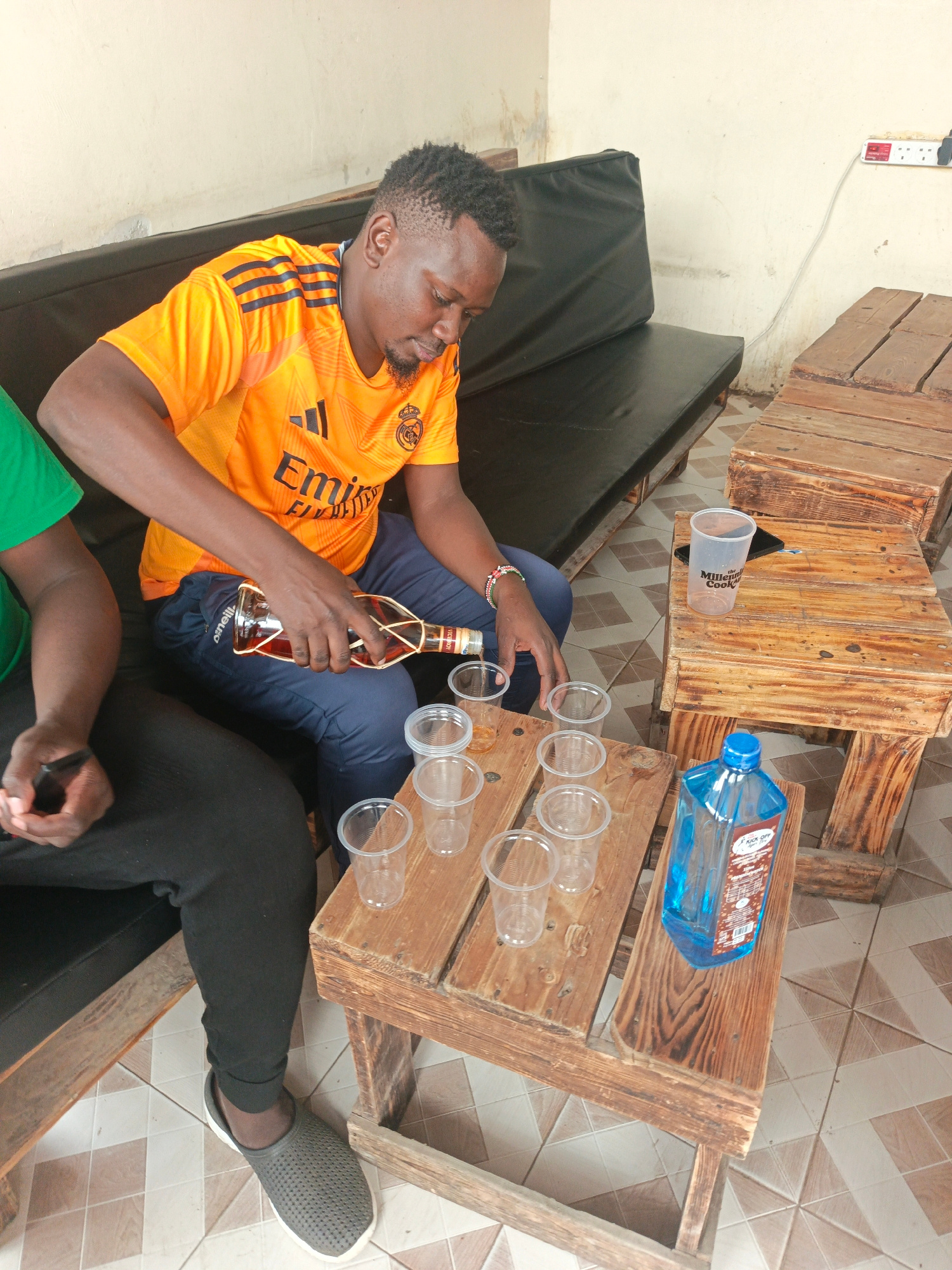 An eye-level shot shows a man pouring liquor into plastic cups while seated on a dark-cushioned bench in a semi-outdoor space. The man is wearing an orange Real Madrid soccer jersey, blue pants, and…read more
