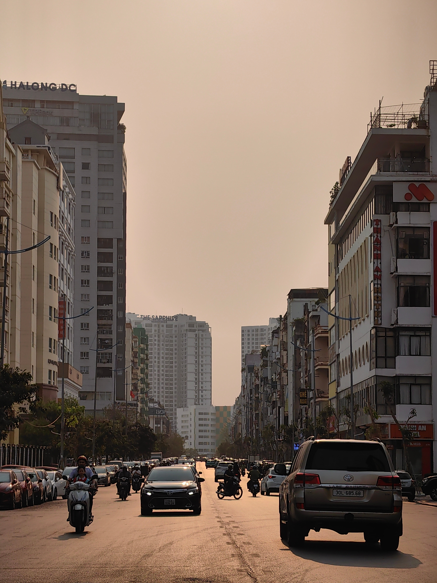 The image depicts a street scene in Hong Gai Ward, Vietnam, characterized by dense urban development. The view is down a wide avenue, with buildings lining both sides. On the left, a taller building w…read more