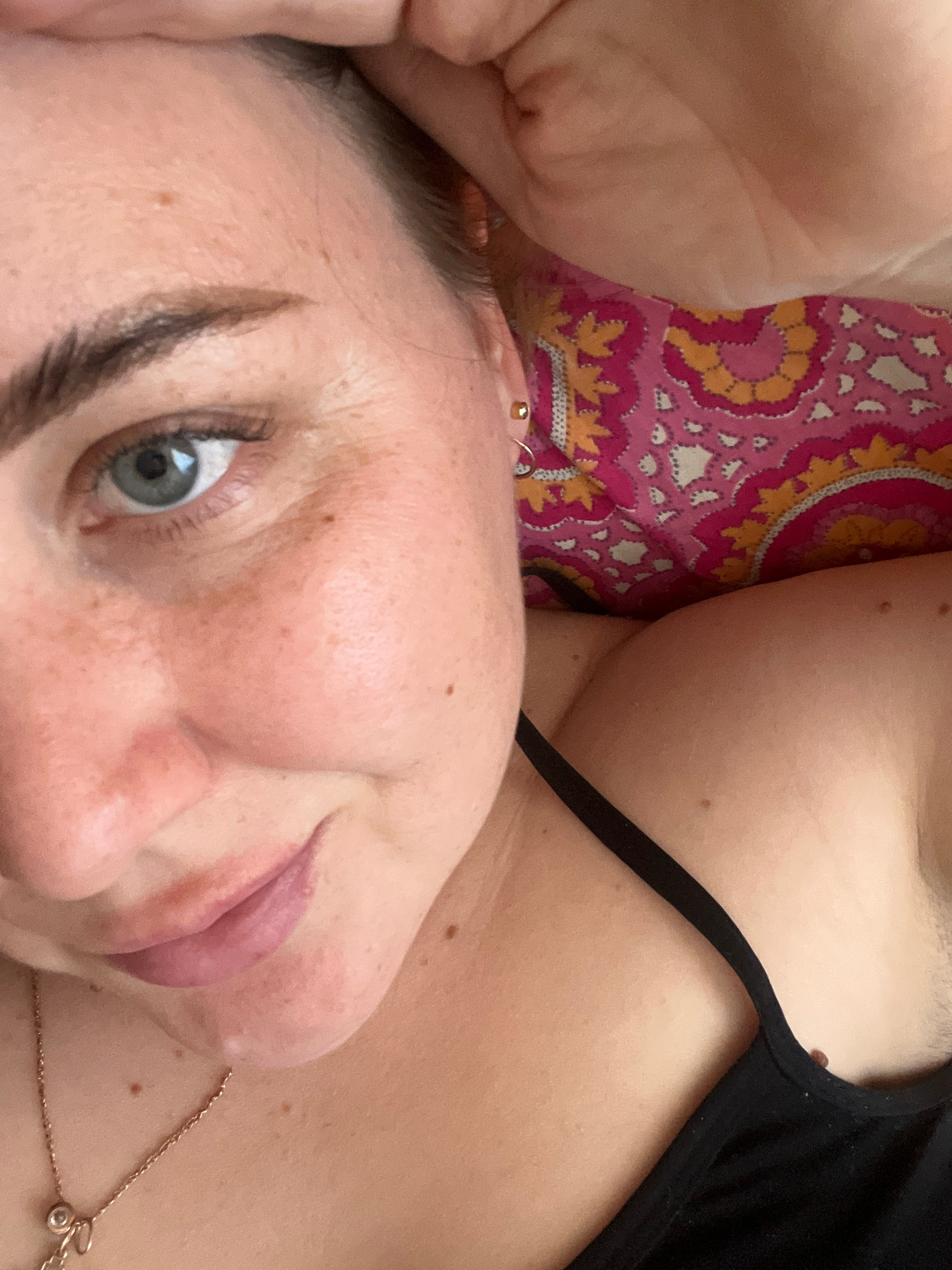 The image presents a close-up, high-angle shot of a woman lying down in an indoor setting in Chaikovsky, Russia. Her face is prominently featured in the foreground, turned to her right, with her gaze…read more