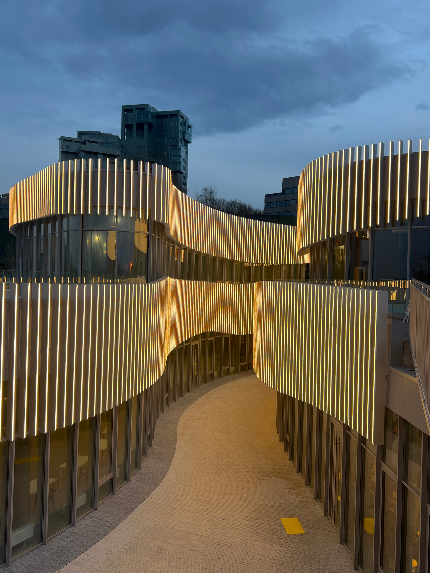 The image depicts a modern architectural structure in Kazan, Russia, identifiable by its distinctive design featuring horizontally aligned, illuminated bars. The building’s facade curves and undulates…read more