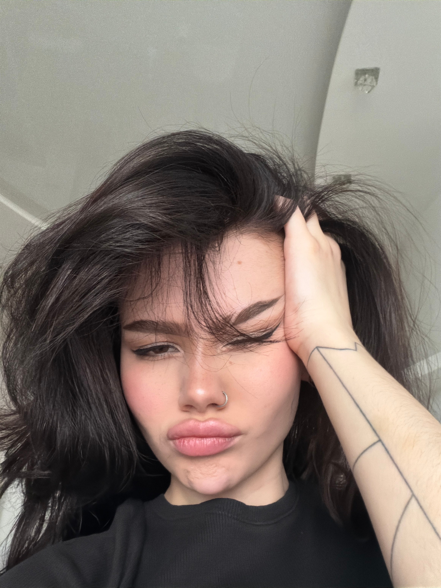 A close-up, rotated image captures a young woman with dark, wavy hair, seemingly lying down indoors. Her head is positioned towards the left side of the frame, with her right arm raised and resting ac…read more
