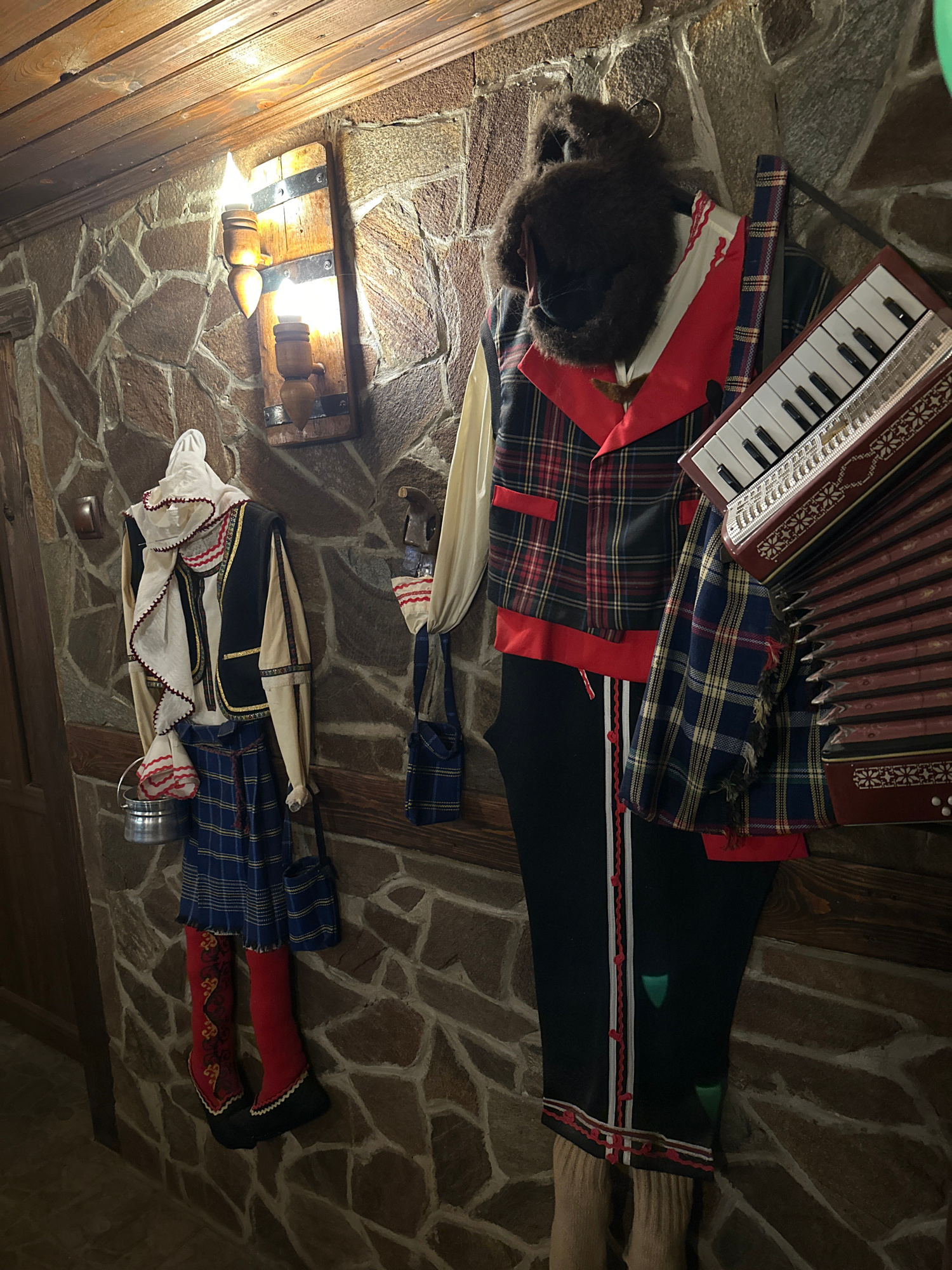 An overhead shot reveals a display within a building, possibly a restaurant or museum, in Berkovitsa, Bulgaria. The scene showcases traditional Bulgarian clothing and artifacts mounted on a stone wall…read more