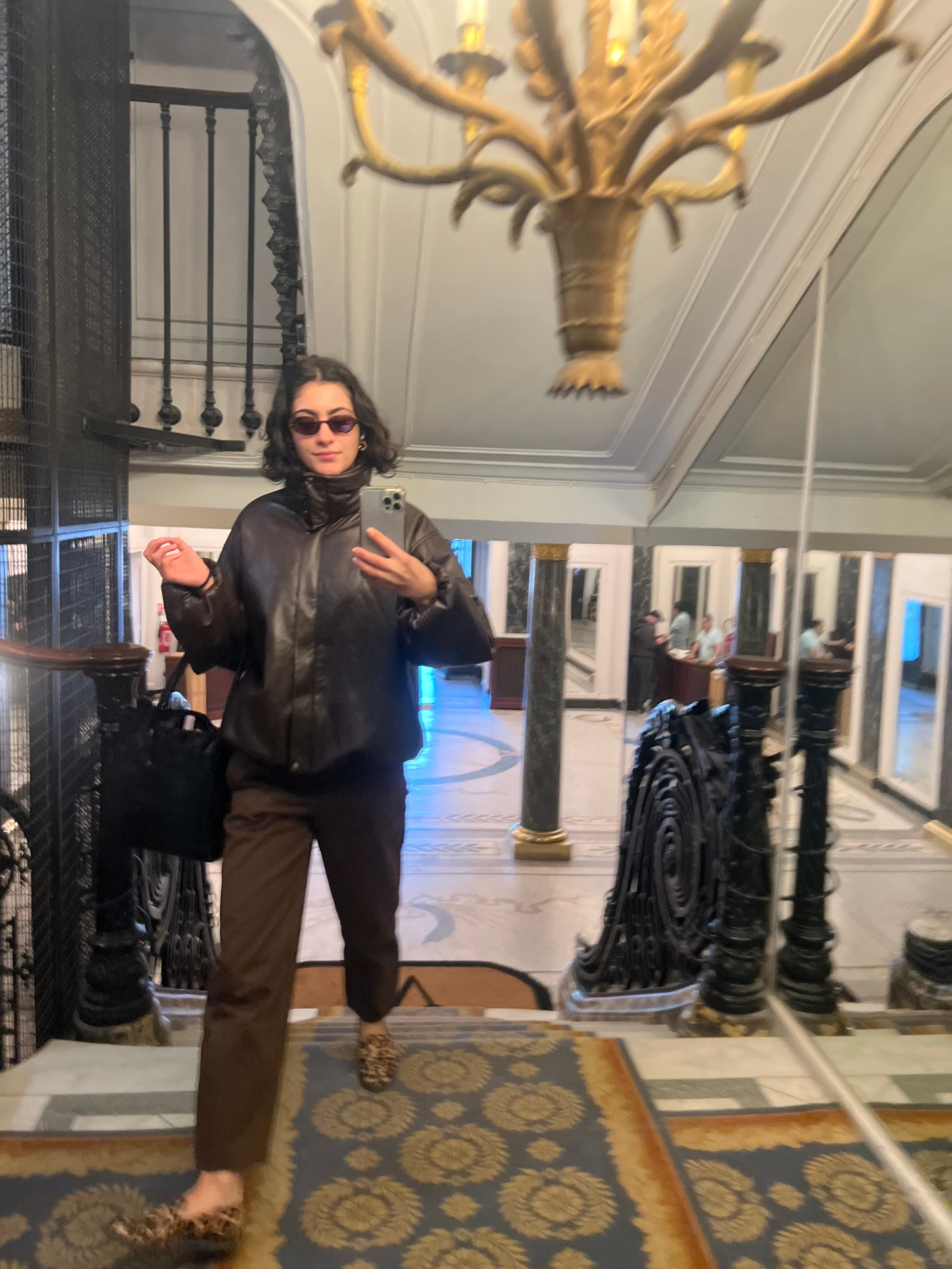 A person stands in front of a mirror. The person is wearing sunglasses, a brown jacket, and brown pants. The person is holding a phone and looking at the camera. Behind the person is a metal railing.…read more