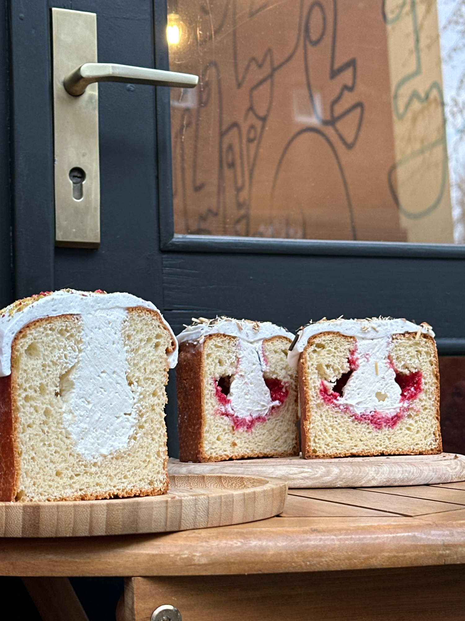 The image shows three slices of cake, stacked vertically and held in a wooden holder. The cake appears to be a brioche type, with a light-colored crumb and a slightly browned crust. Each slice is fill…read more