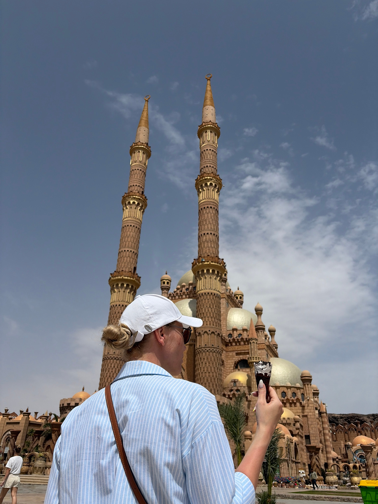 A woman in a blue striped shirt and white cap takes a photo with her phone of the Al-Mustafa Mosque in Sharm El Sheikh, Egypt. The mosque is made of light brown stone and has two tall minarets and sev…read more