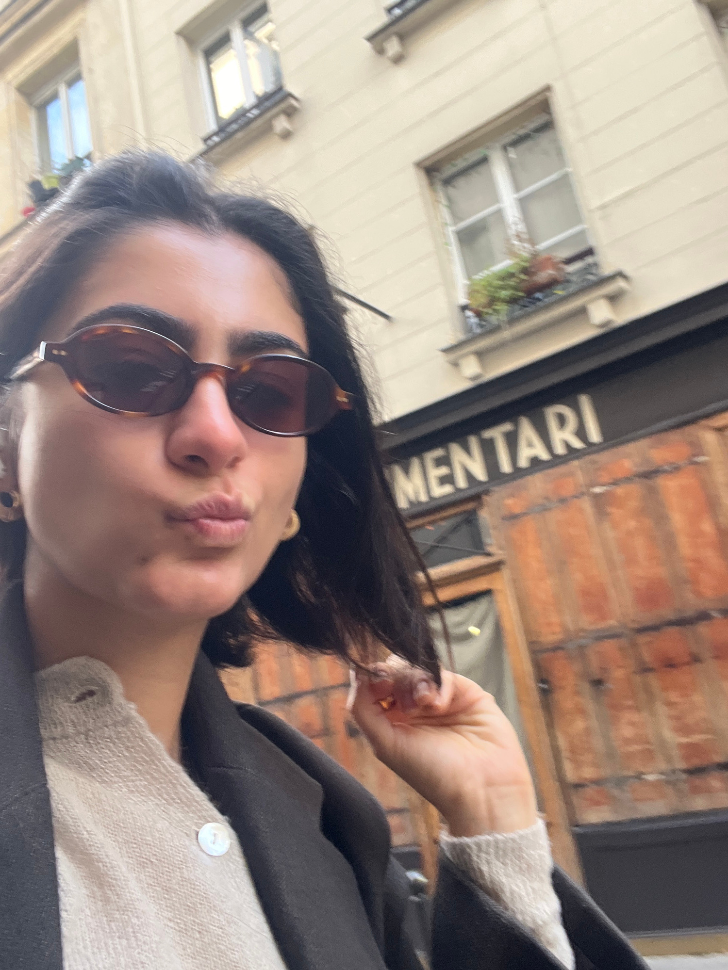 The image is a dynamic, angled close-up selfie of a young woman in an urban setting, consistent with Paris, France. She looks directly at the camera, pouting her lips in a "kissy face" or "duck face"…read more