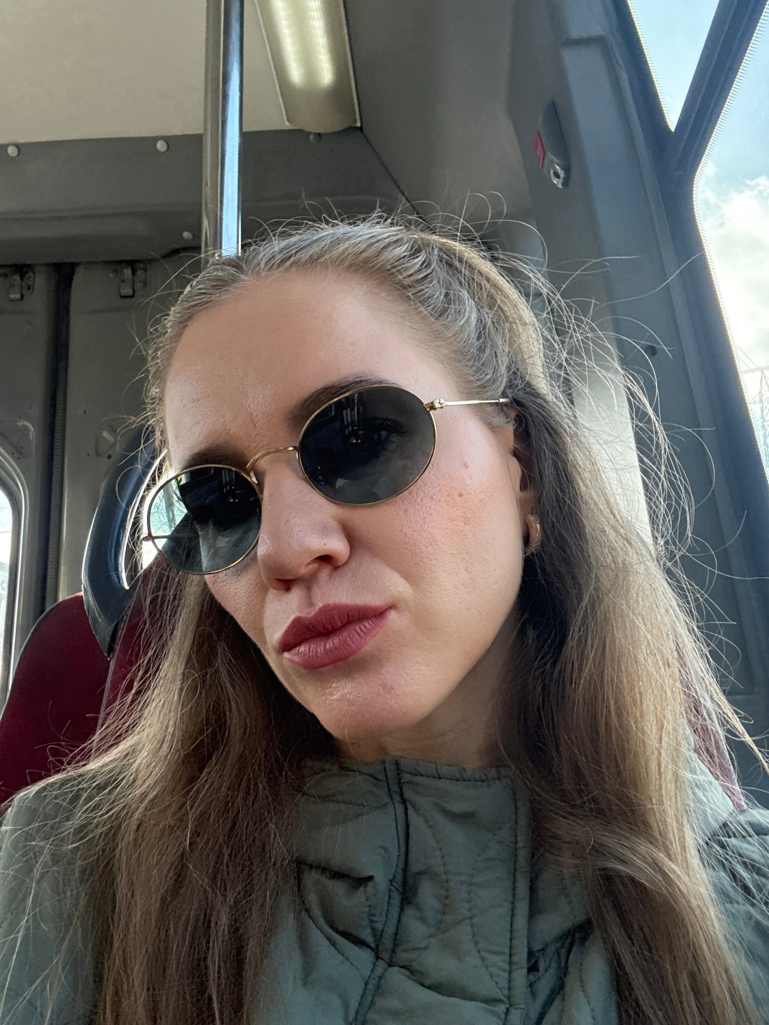 A female subject is depicted in a close-up, selfie-style photograph taken inside a public transport vehicle, specifically a bus or dolmuş, located in Büyükçekmece, Turkey. The woman has long, light br…read more