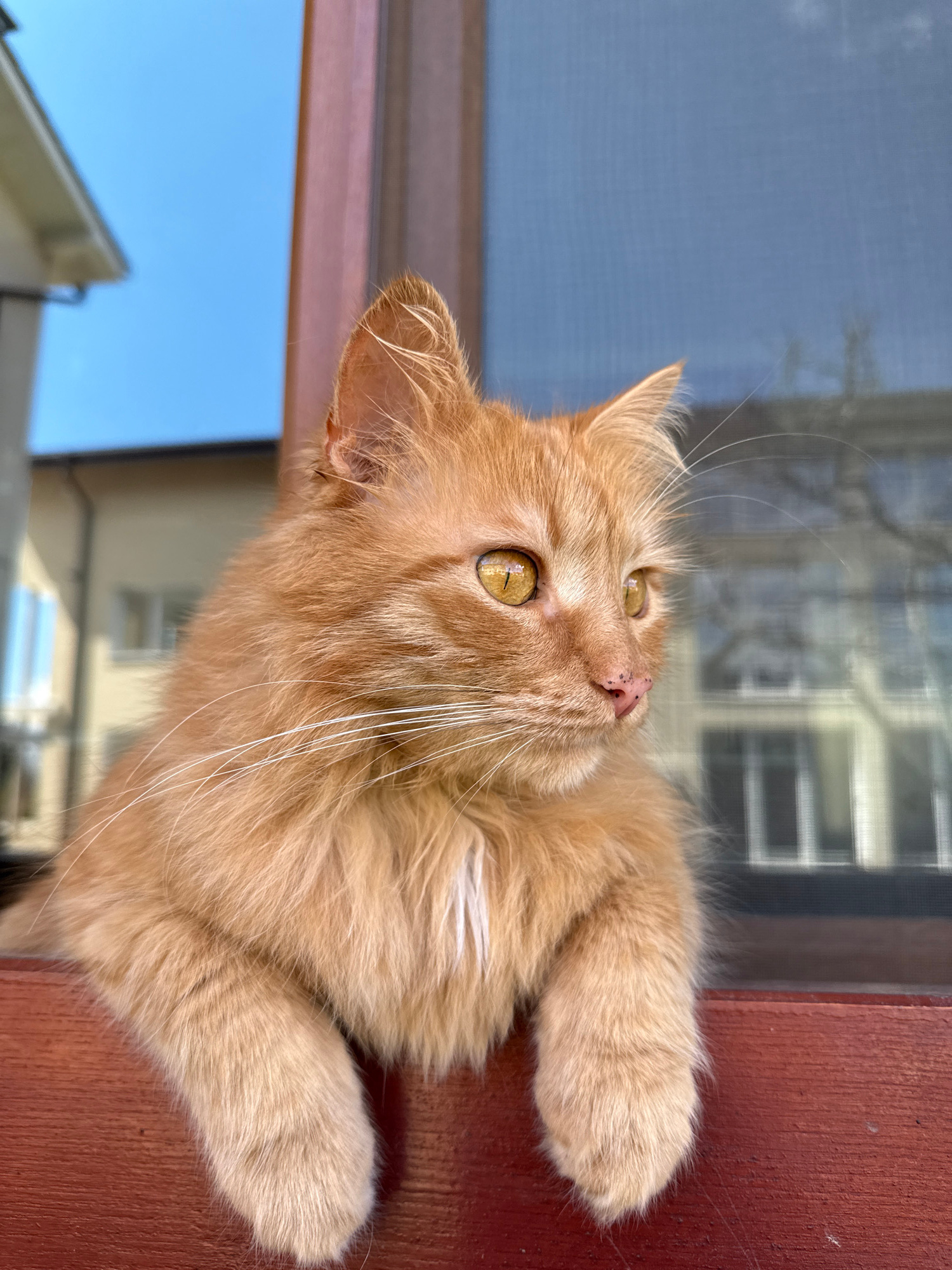A medium shot of an orange cat lying on a dark red surface. The cat has yellow eyes and white whiskers. The cat is looking upwards. A window is behind the cat with a view of a building and a blue sky.…read more