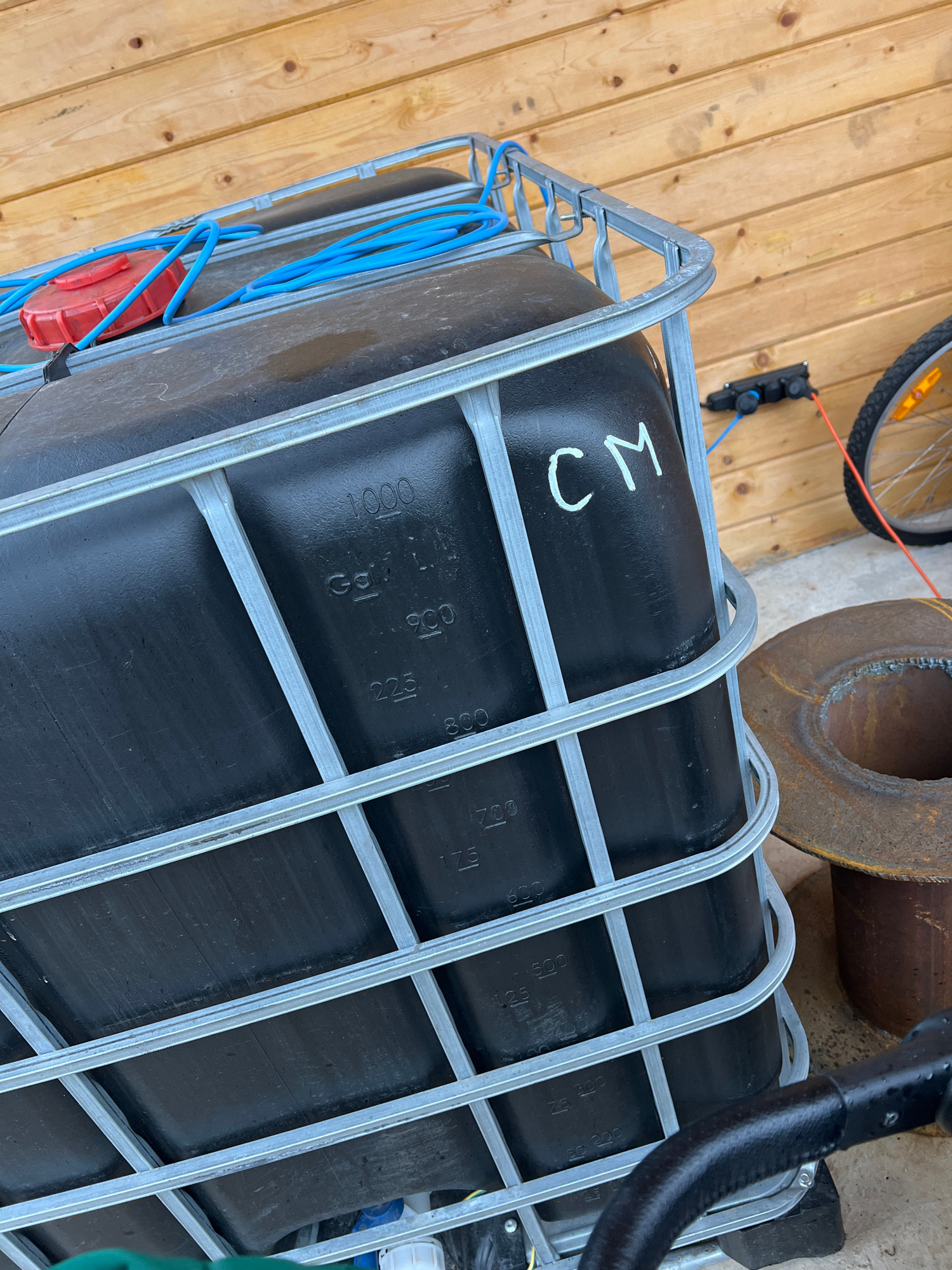 The image shows an IBC (Intermediate Bulk Container) with a metal cage, resting on a wooden surface. The container is black and has markings indicating volume measurements (1000, 900, 800, 725, 600, 5…read more