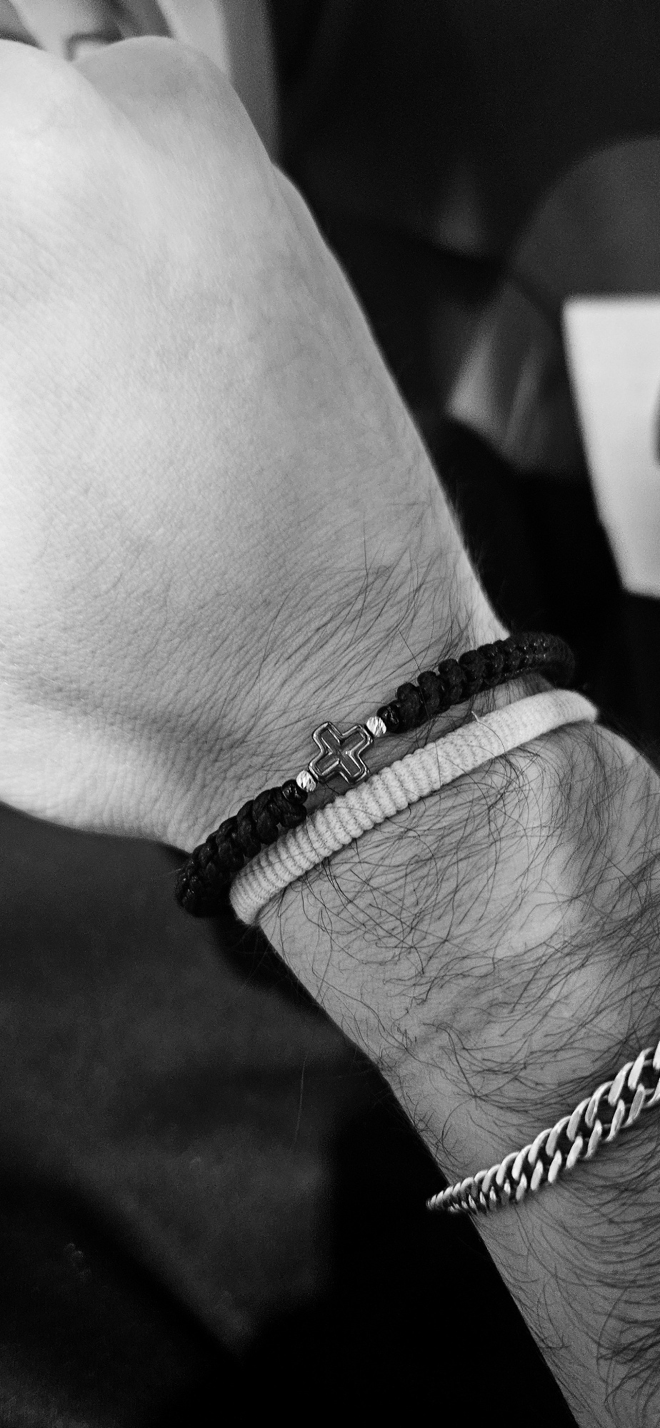 The image depicts a wrist with three bracelets. The bracelets are, from left to right: a black braided bracelet with a silver cross charm, a white rope bracelet, and a silver chain-link bracelet. The…read more