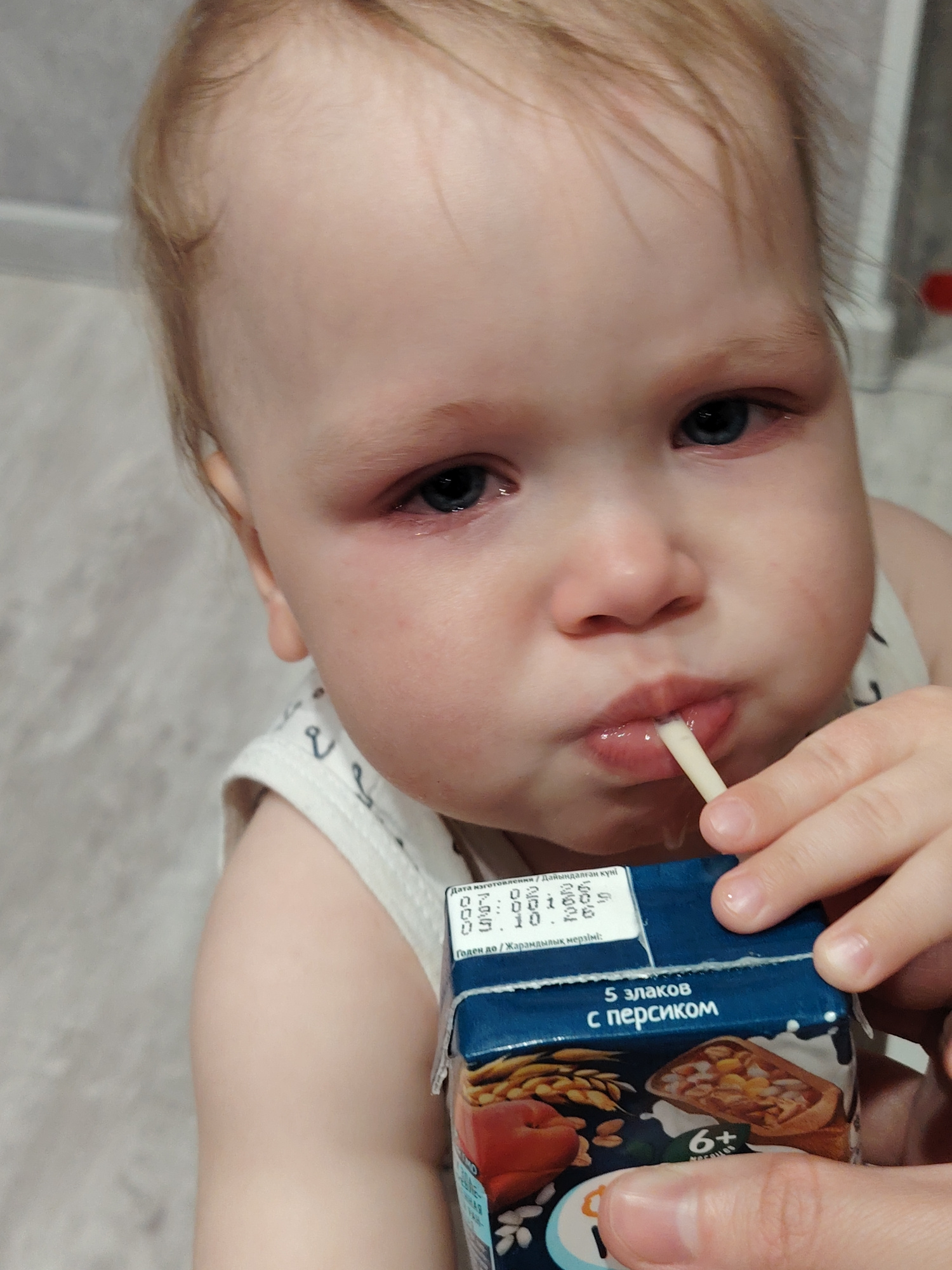 A close-up photograph features a young child with fair skin and light brown hair drinking from a small blue and white juice carton with a straw. The child's eyes appear watery, with redness around the…read more