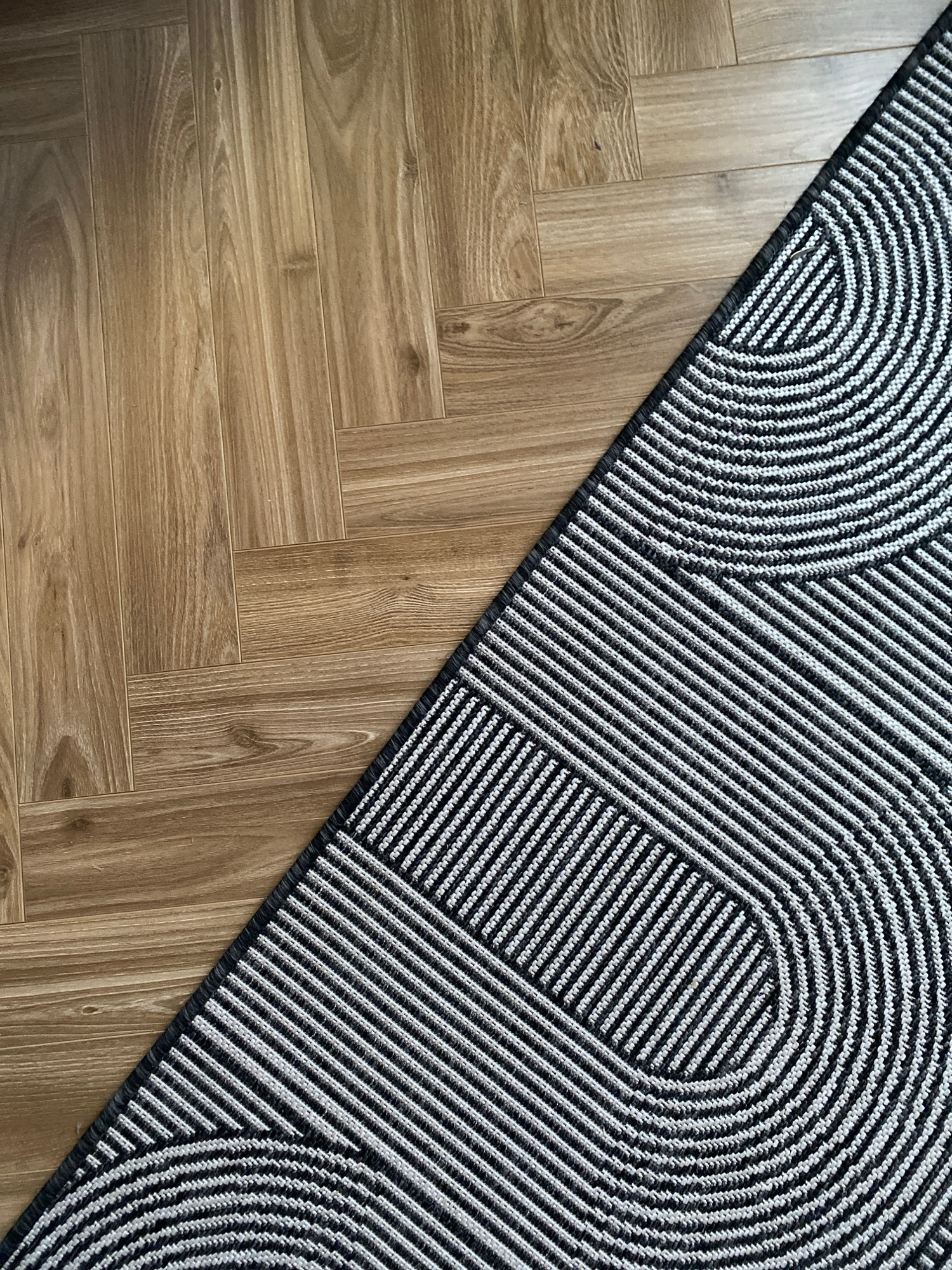 The image shows a section of a room with wooden flooring and a patterned rug. The flooring is laid in a herringbone pattern and appears to be made of wood or a wood-like material. The rug is positione…read more