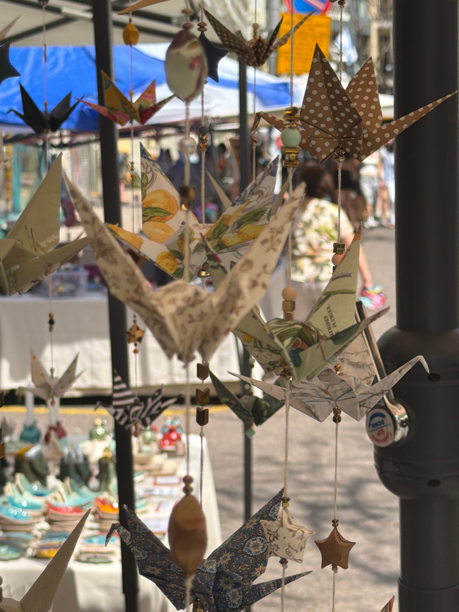 The image captures a vibrant, handmade mobile or garland featuring numerous origami figures, predominantly birds (cranes) and stars, strung on horizontal lines. The display hangs in the foreground, wi…read more