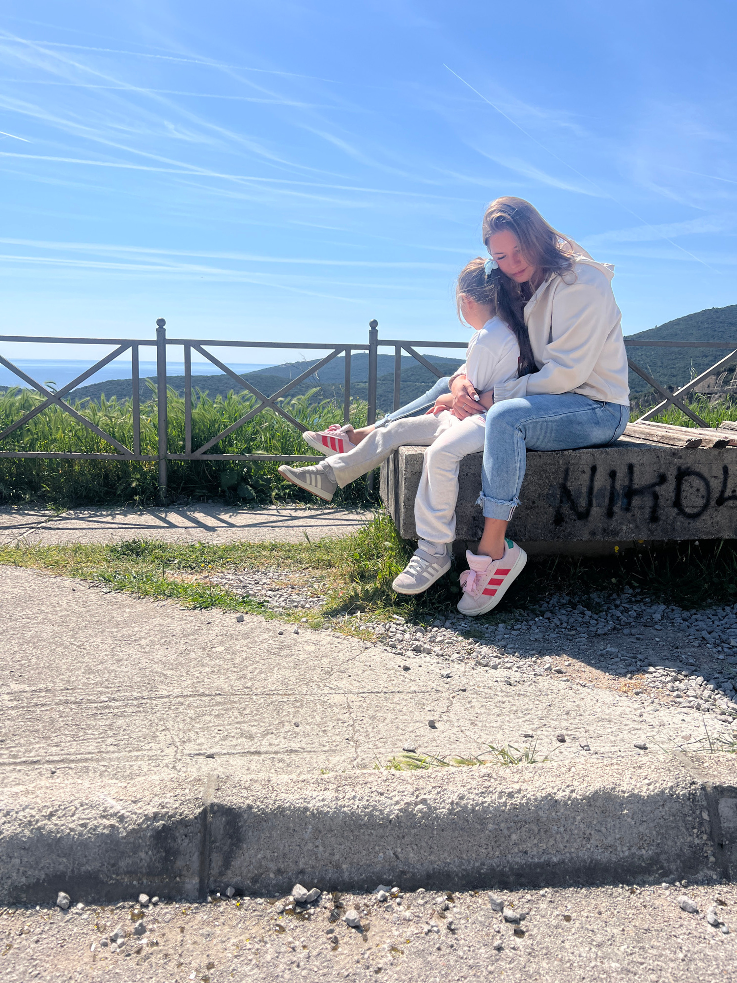 Two individuals, presumably a mother and child, are interacting on a concrete structure. The taller figure, a female with long brown hair, is wearing a light-colored jacket, blue jeans, and pink sneak…read more