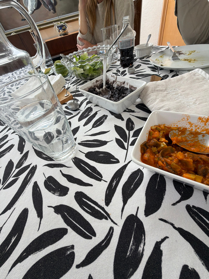 A table with a black and white leaf-patterned tablecloth features a selection of dishes. Square white bowls contain stewed vegetables and a dark, possibly berry-based, dessert. A salad sits in a clear…read more