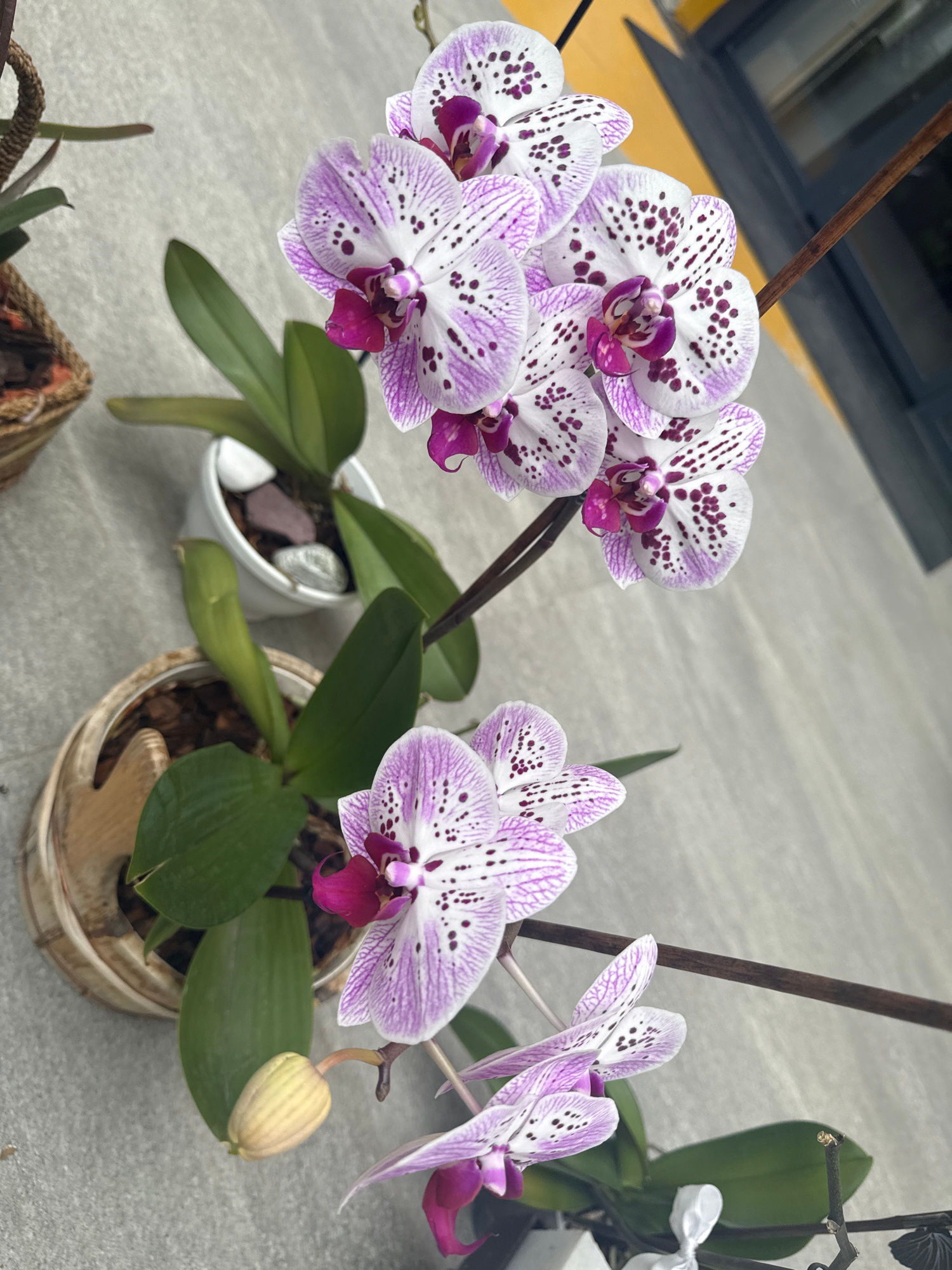 This image displays two potted Phalaenopsis orchid plants positioned on a light grey concrete or tiled surface in Alanya, Turkey. The primary orchid in the foreground exhibits a main stem bearing seve…read more