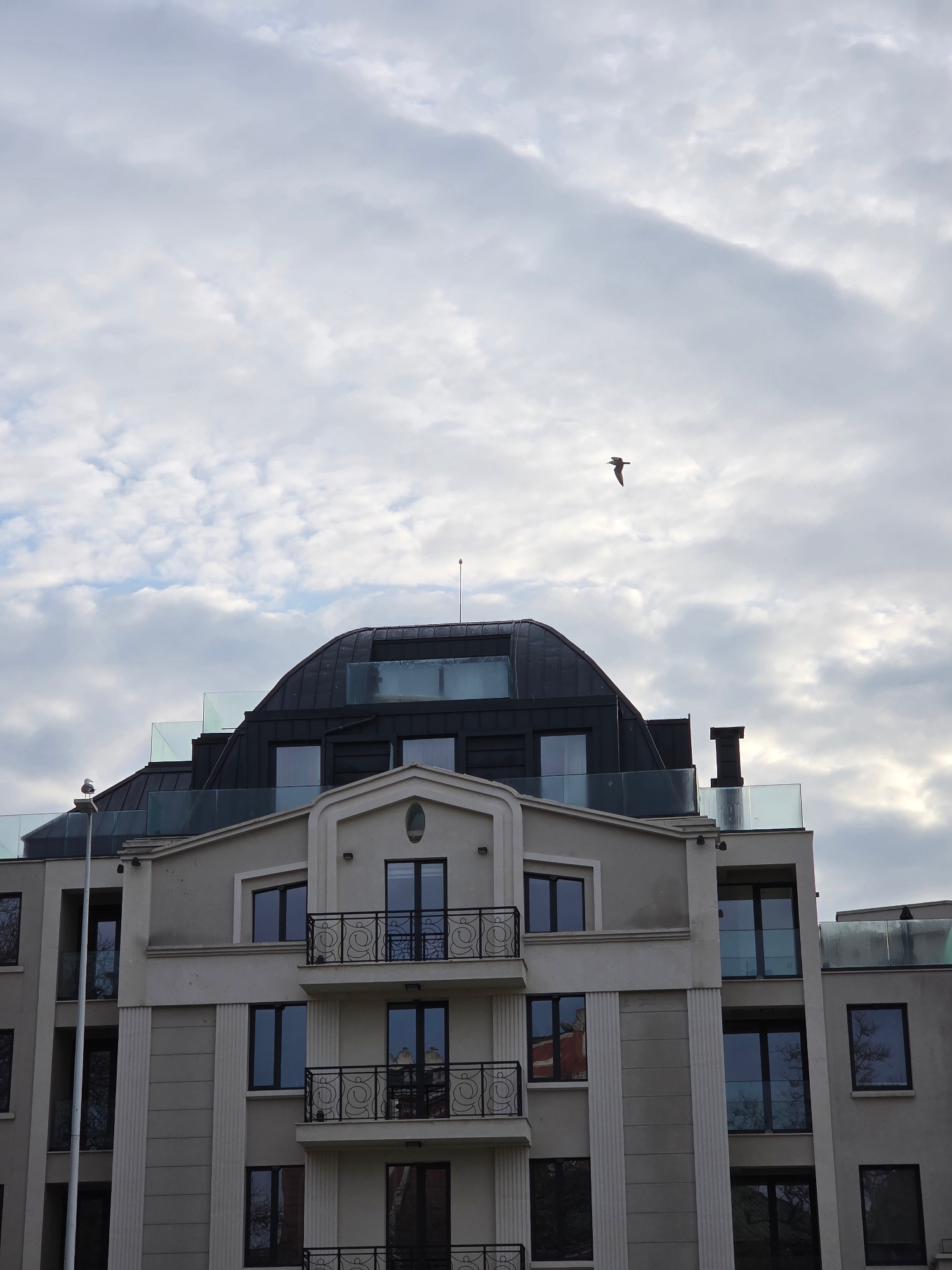 The image depicts a modern building in Varna, Bulgaria, viewed from a low angle. The building is multi-storied with a beige facade and dark window frames, exhibiting architectural details such as deco…read more