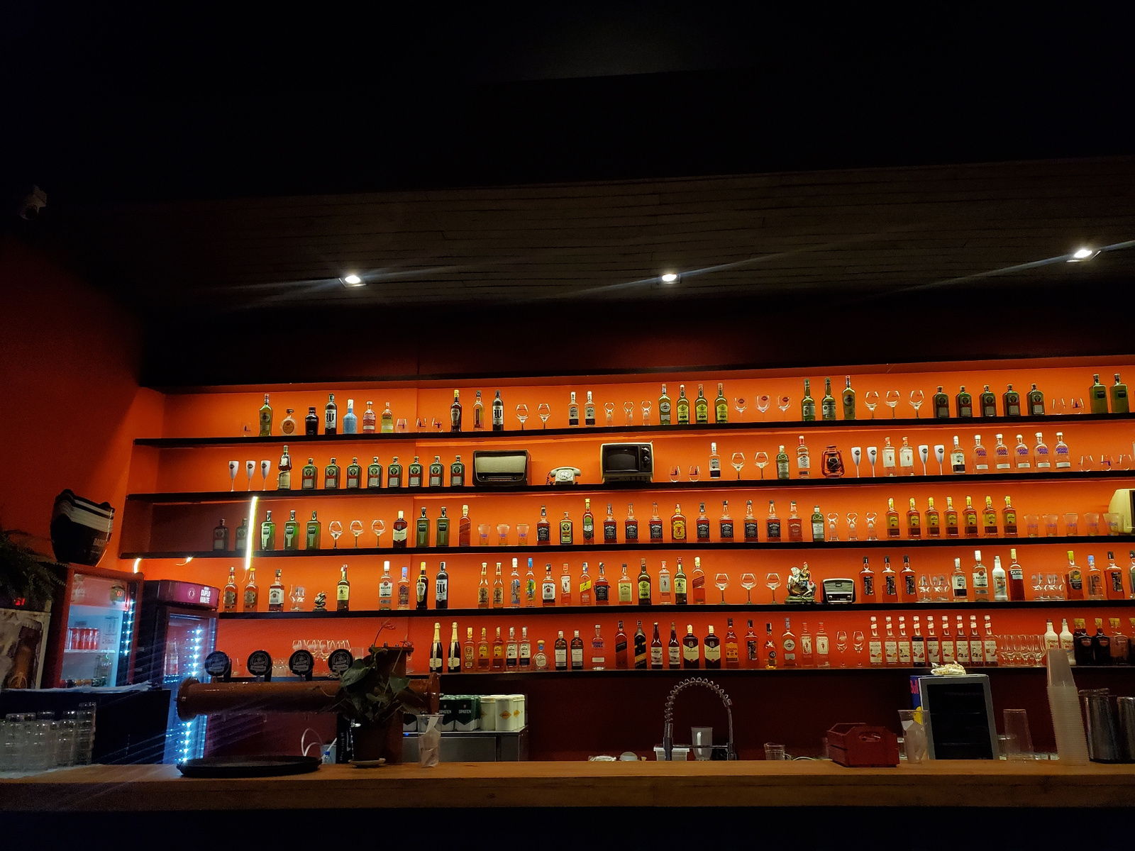 This image captures the interior of a well-stocked bar or pub, likely in Curitiba, Brazil, viewed from a slightly elevated perspective towards the counter and back wall. The central feature is a strik…read more