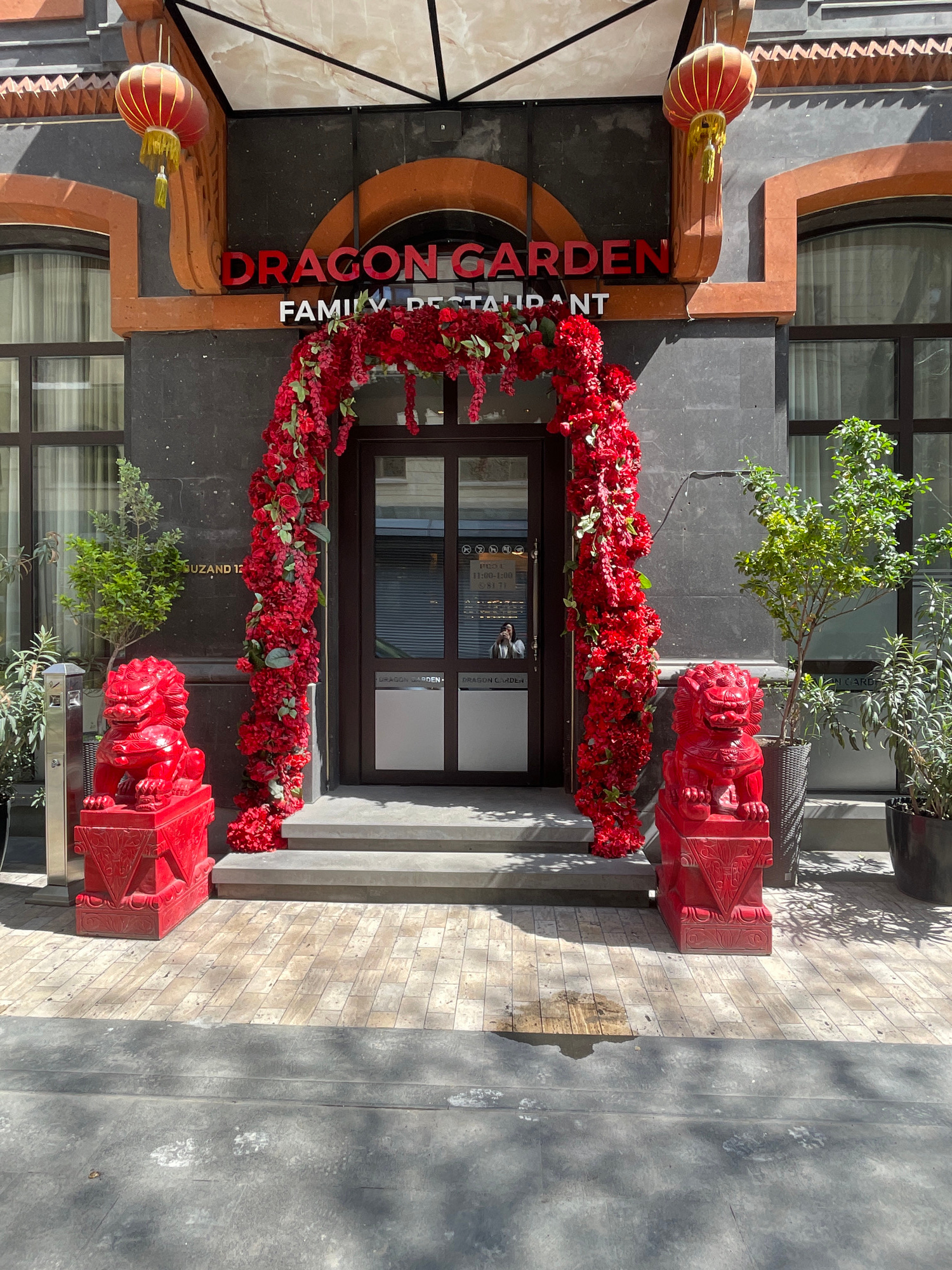 The image shows the exterior of the "Dragon Garden Family Restaurant" located at Suzand 12 in Yerevan, Armenia. The restaurant's name is prominently displayed in red lettering, with the words "Family…read more