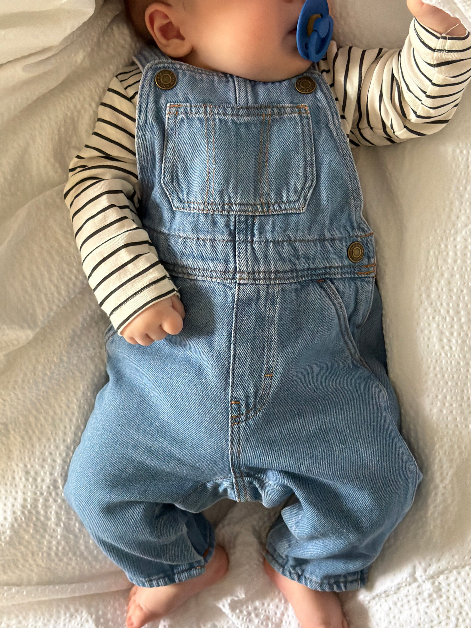 An overhead, slightly angled shot captures a baby lying on its back on a white, textured surface, likely a blanket or mattress cover. The baby's head is positioned to the left, with its bare feet visi…read more
