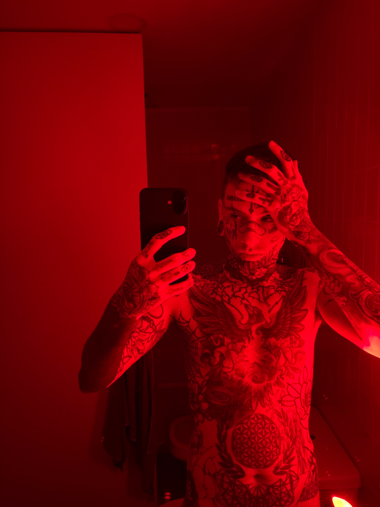 A partially nude, heavily tattooed person is reflected in a mirror in a red-lit room. The person is holding a black smartphone and appears to be taking a selfie. No specific details indicate the locat…read more
