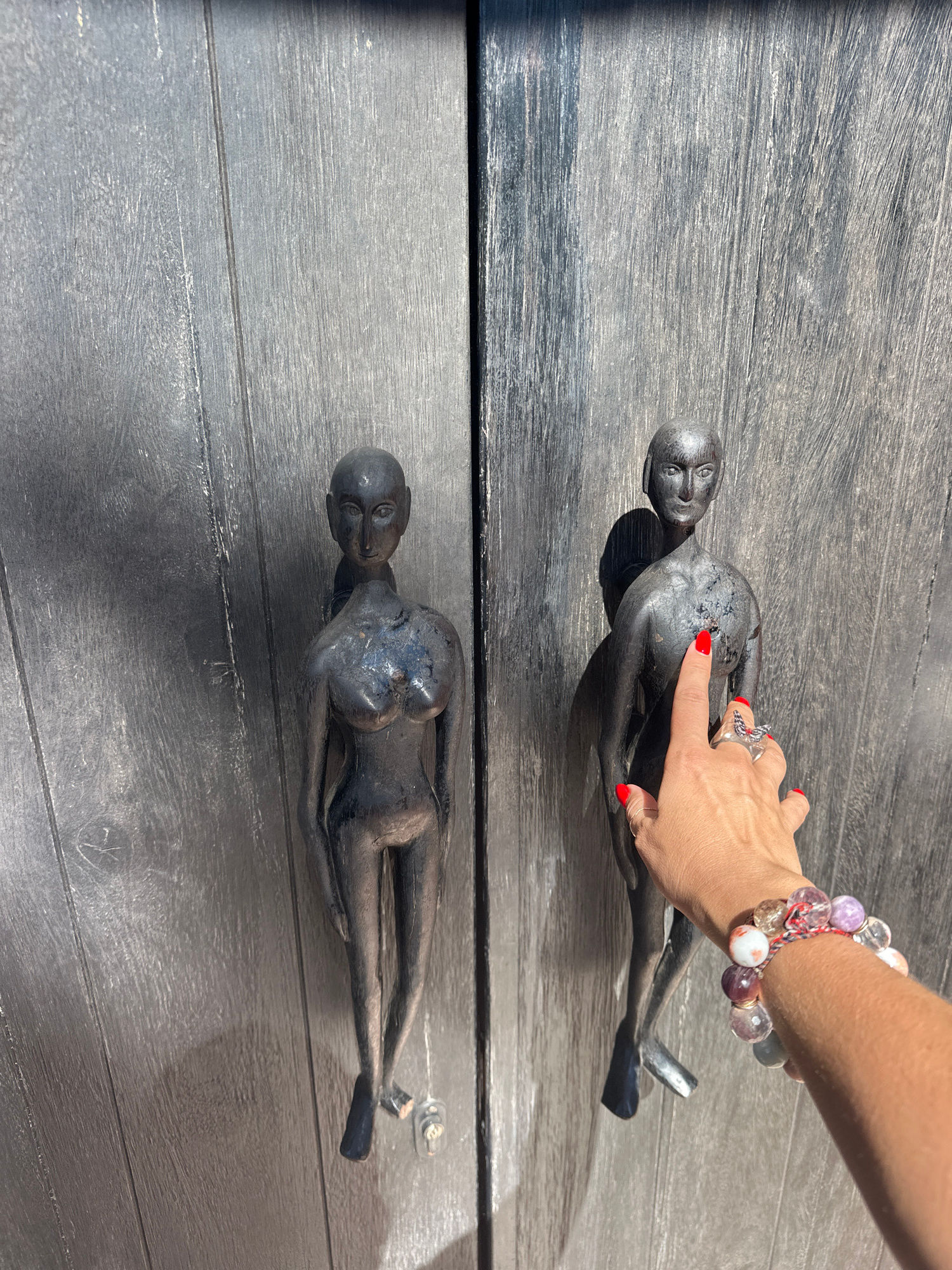 A photograph depicts a cast or carved figure of a woman lying on what appears to be a wooden surface. The figure is grey/silver and lying on its side. A hand is pointing at the figure. The woman has a…read more